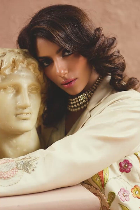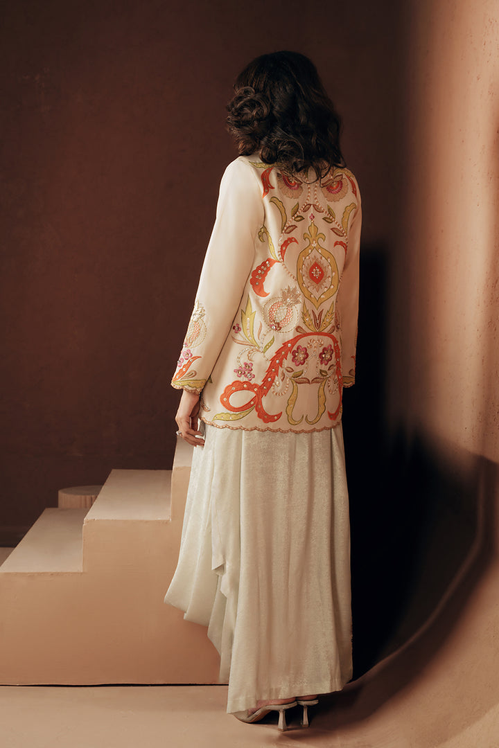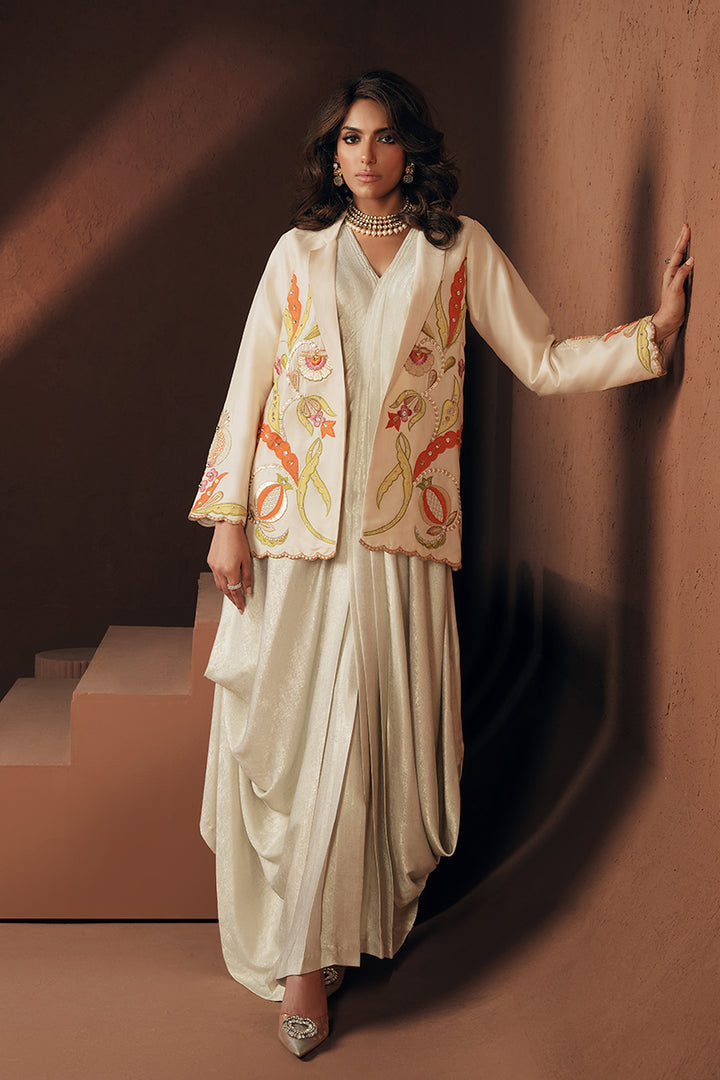 Our signature formal drape is paired with a stunning jacket in a mesmerizing palette of ivory, lime, and burnt orange. Adorned with intricate embroidery, delicate resham thread work, and our signature leather appliqué, where artistry meets timeless sophistication.