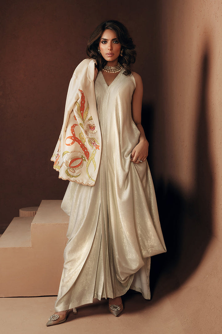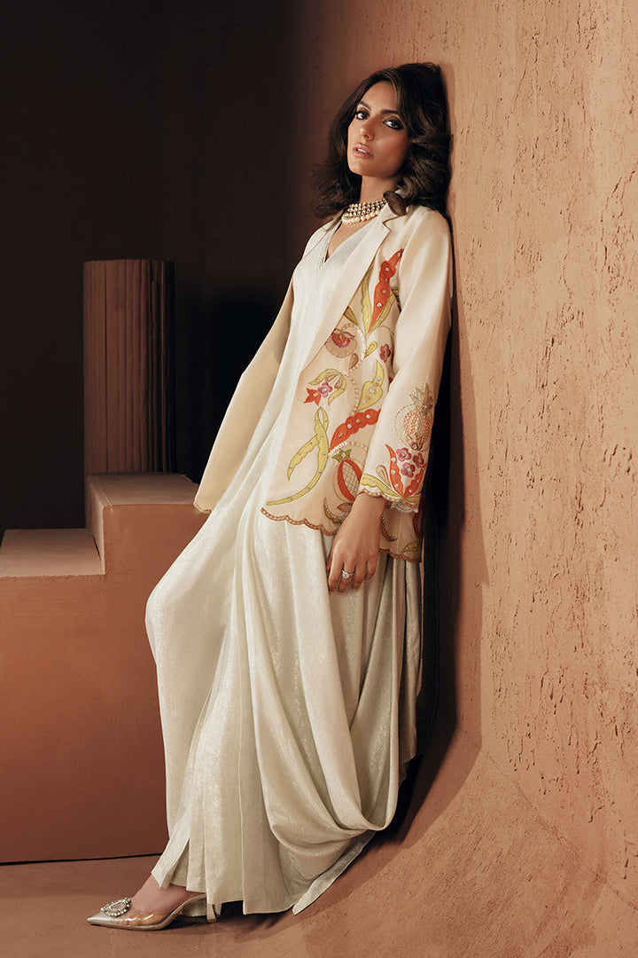 Our signature formal drape is paired with a stunning jacket in a mesmerizing palette of ivory, lime, and burnt orange. Adorned with intricate embroidery, delicate resham thread work, and our signature leather appliqué, where artistry meets timeless sophistication.