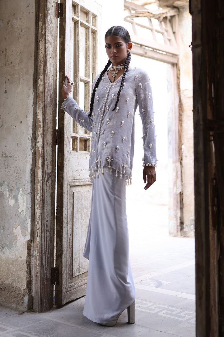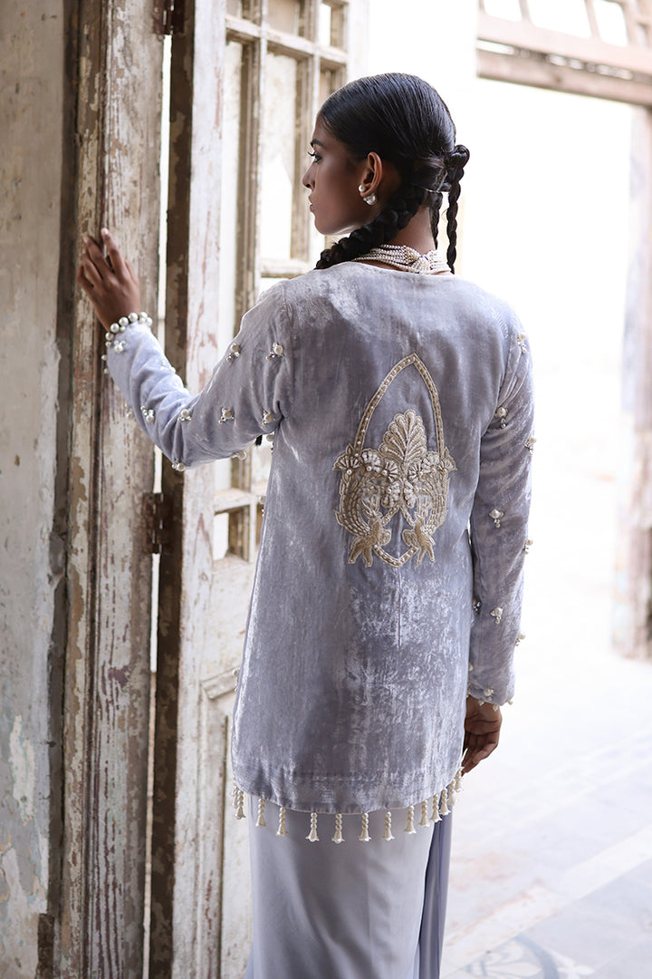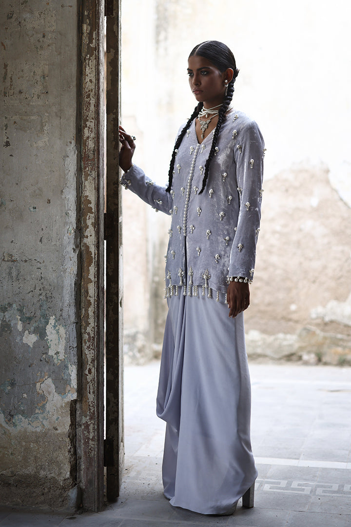 A vision of modern glamour, this short formal jacket style shirt in stunning silver Pure Velvet is hand-embellished with Swarovski crystals and delicate pearl work, featuring a statement back motif crafted in fine thread and pearls. Paired with our signature drape dhoti skirt, it strikes the perfect balance between artisanal craftsmanship and contemporary flair.