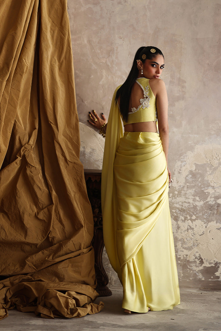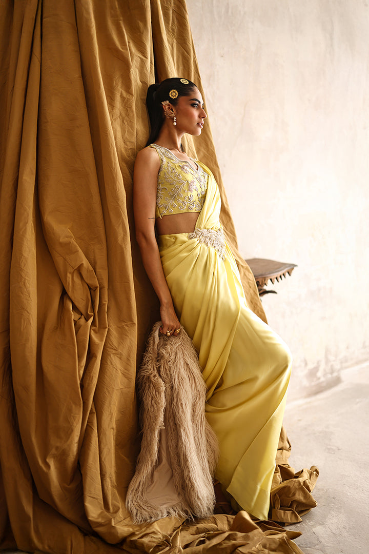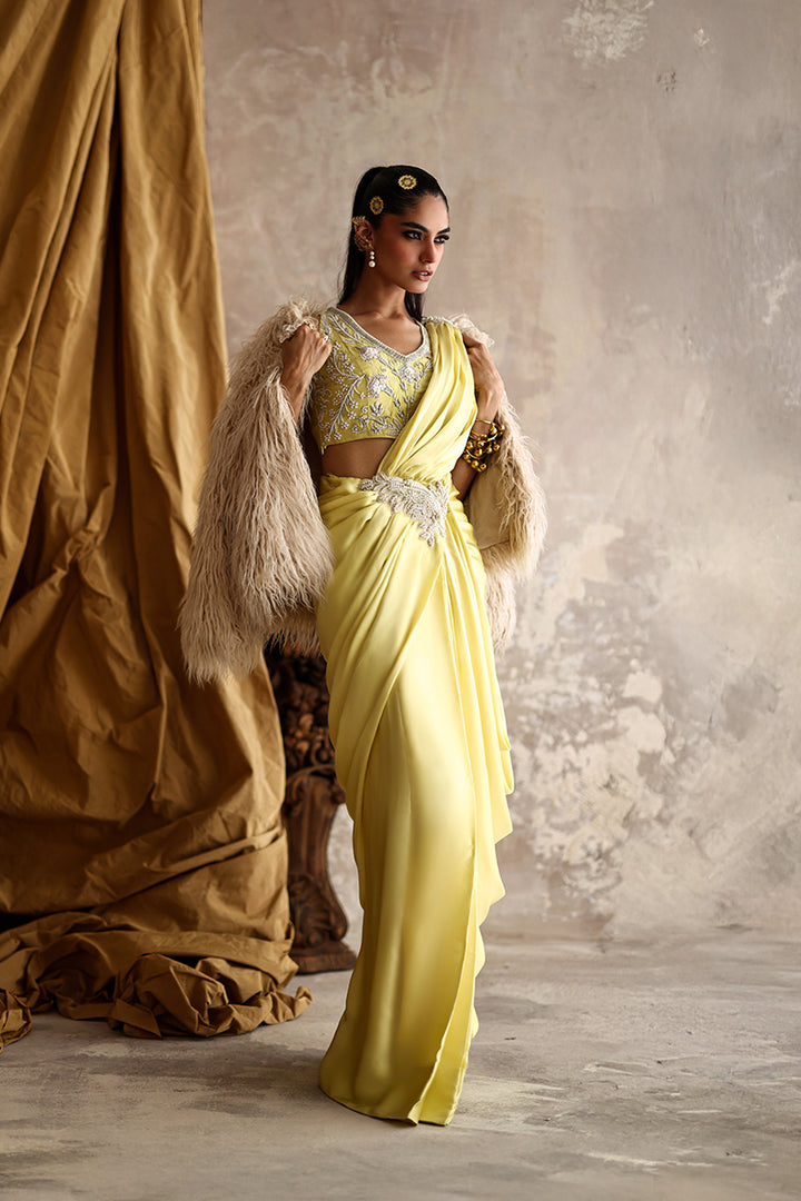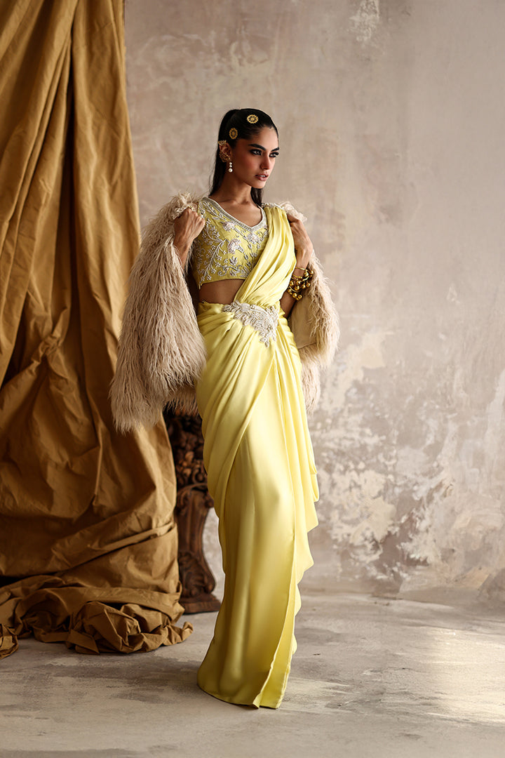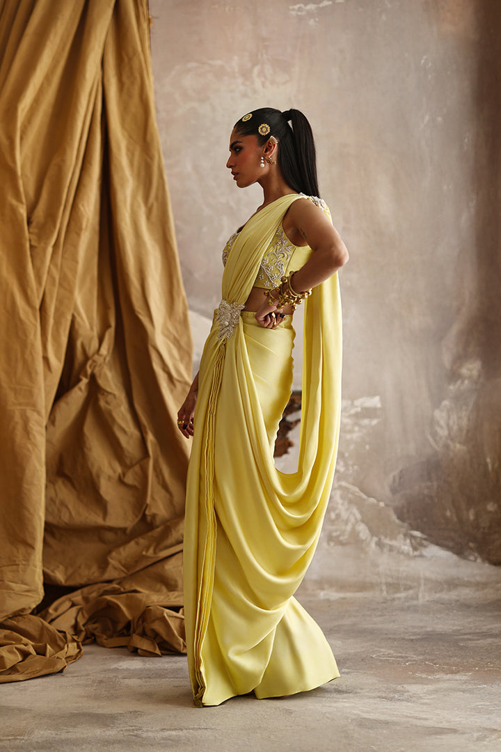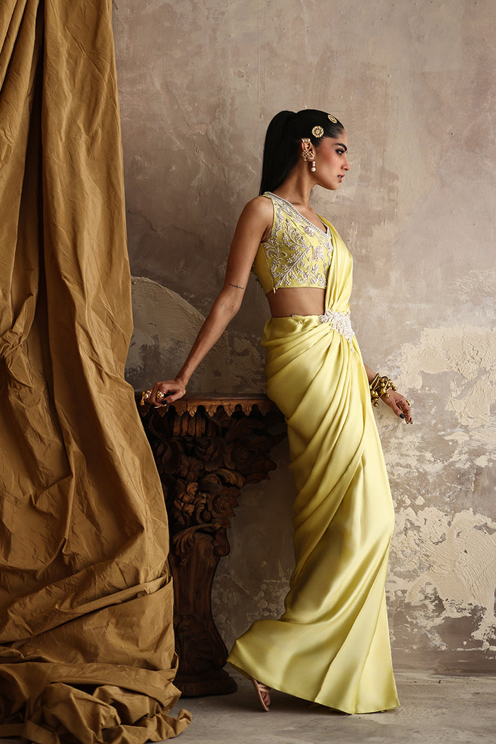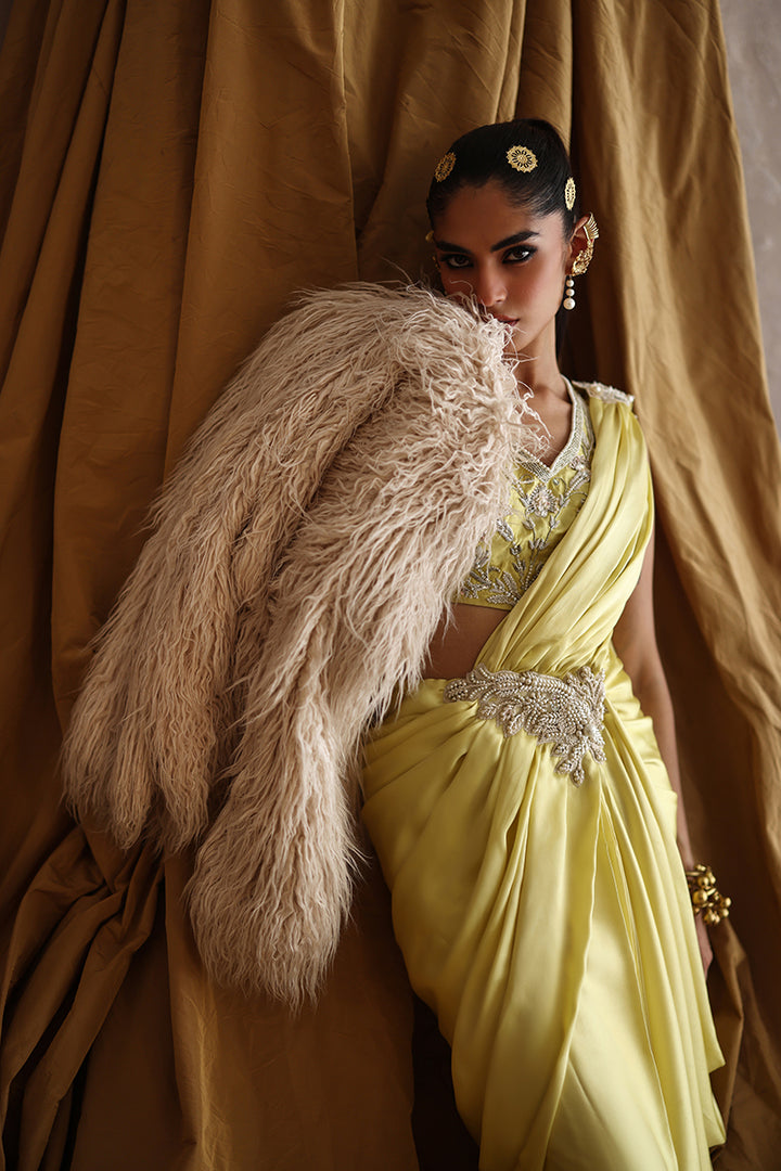 A vision of refined glamour, his pre-stitched saree in pure charmeuse silk is a masterpiece of craftsmanship. Drenched in a stunning lime green hue, it features intricate hand embroidery with zardozi, crystal, and pearl work, beautifully finished with delicate crystal embellishments. An ensemble that redefines elegance and modern luxury.