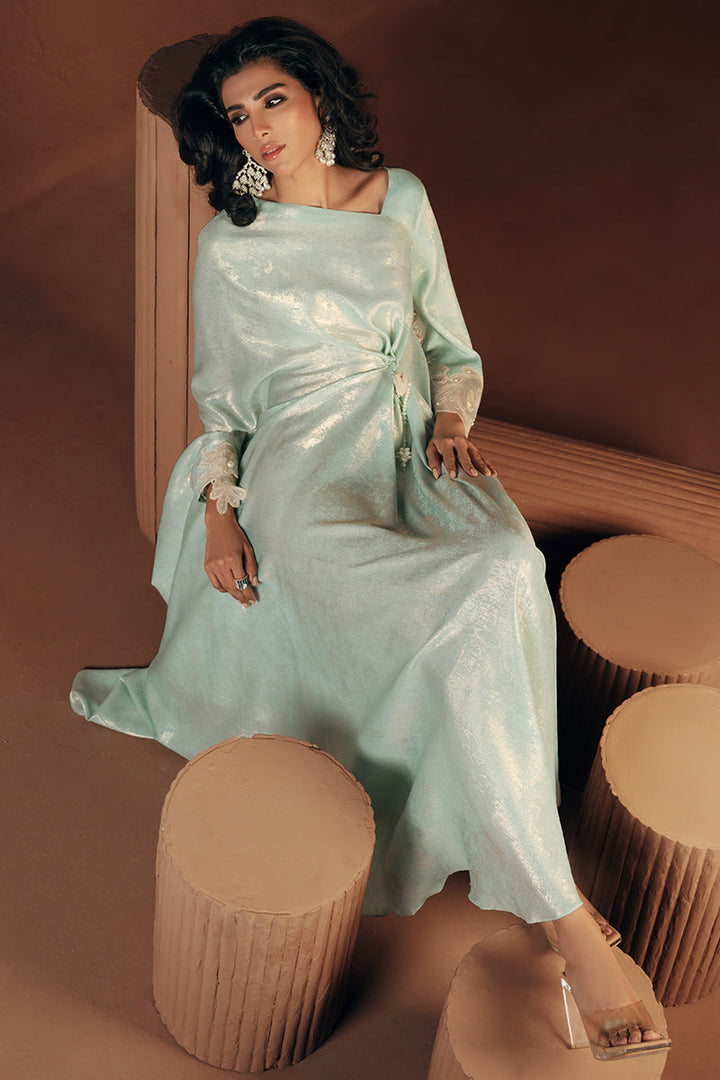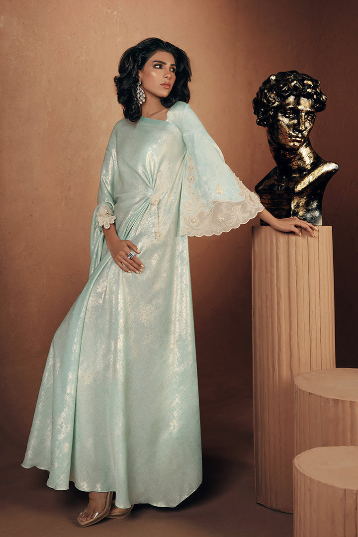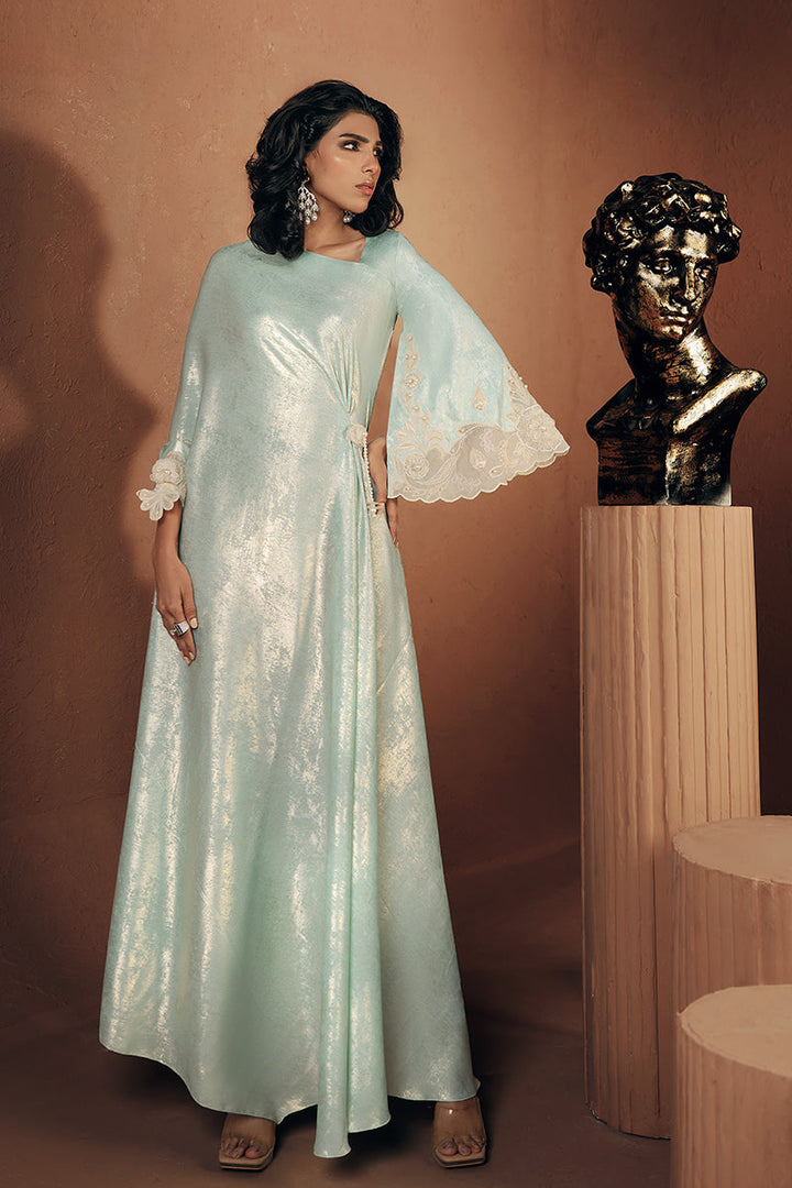 A formal drape in shimmering icy blue, adorned with intricate hand embroidery, delicate pear & thread work, and exquisite handmade lace cutwork detailing. A masterpiece of grace and luxury.