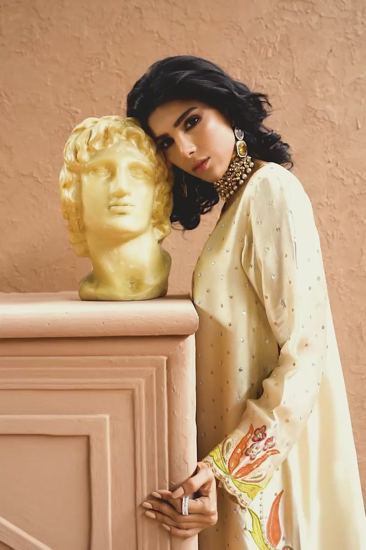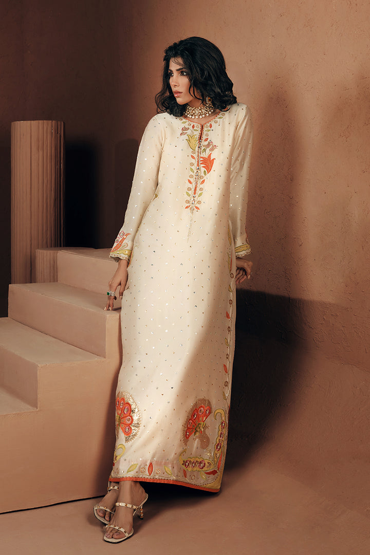 A formal kaftan in a striking blend of ivory, lime, and burnt orange, adorned with intricate embroidery, delicate Reshma thread work, and our signature gold leather appliqué. A true statement of refined luxury.