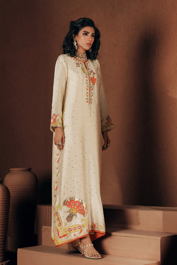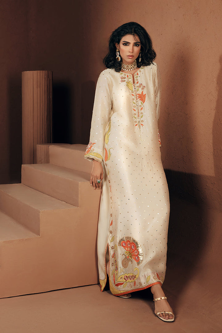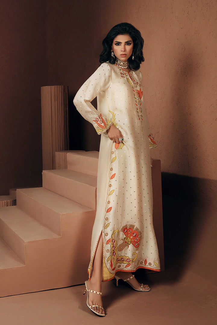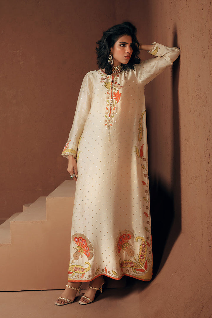 A formal kaftan in a striking blend of ivory, lime, and burnt orange, adorned with intricate embroidery, delicate Reshma thread work, and our signature gold leather appliqué. A true statement of refined luxury.