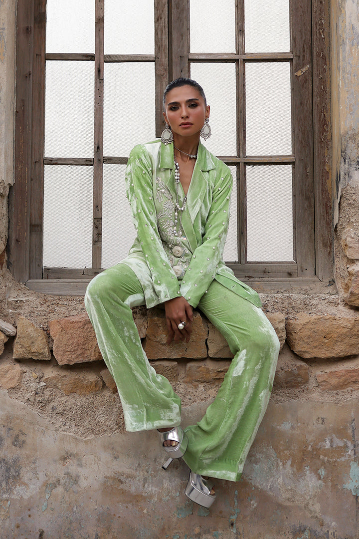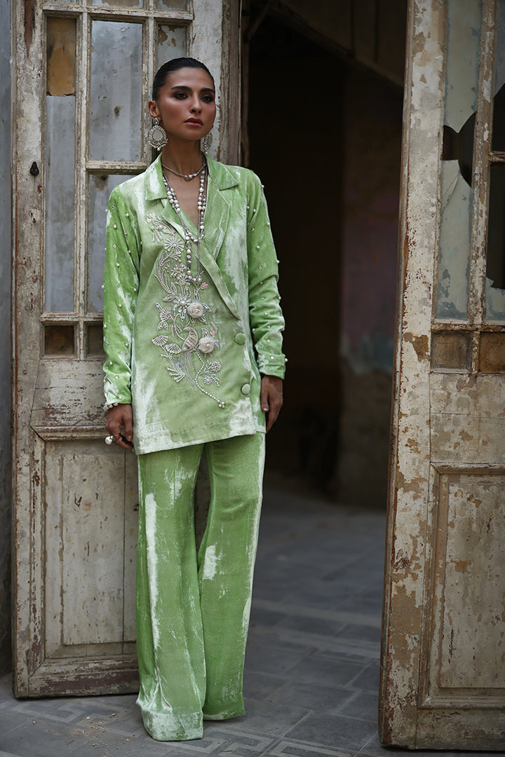 A statement in contemporary couture, this modern jacket, crafted in lush apple-green pure velvet, is meticulously hand-embroidered with pearls, zardozi, sequins, and Swarovski crystals, adorned with handcrafted organza flowers for a touch of artistic romance.