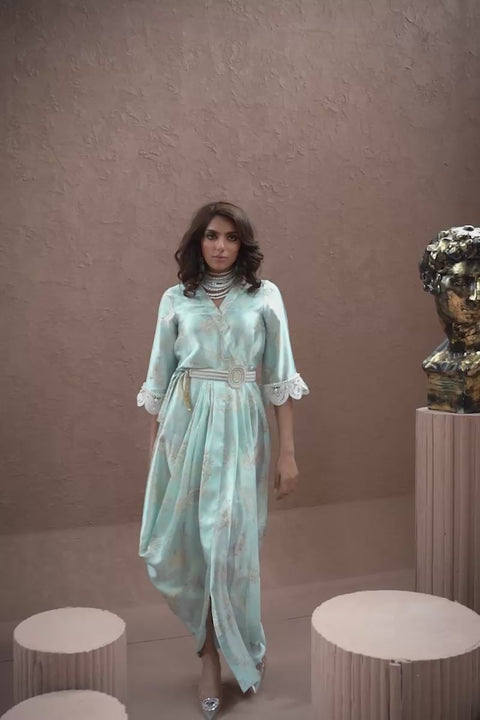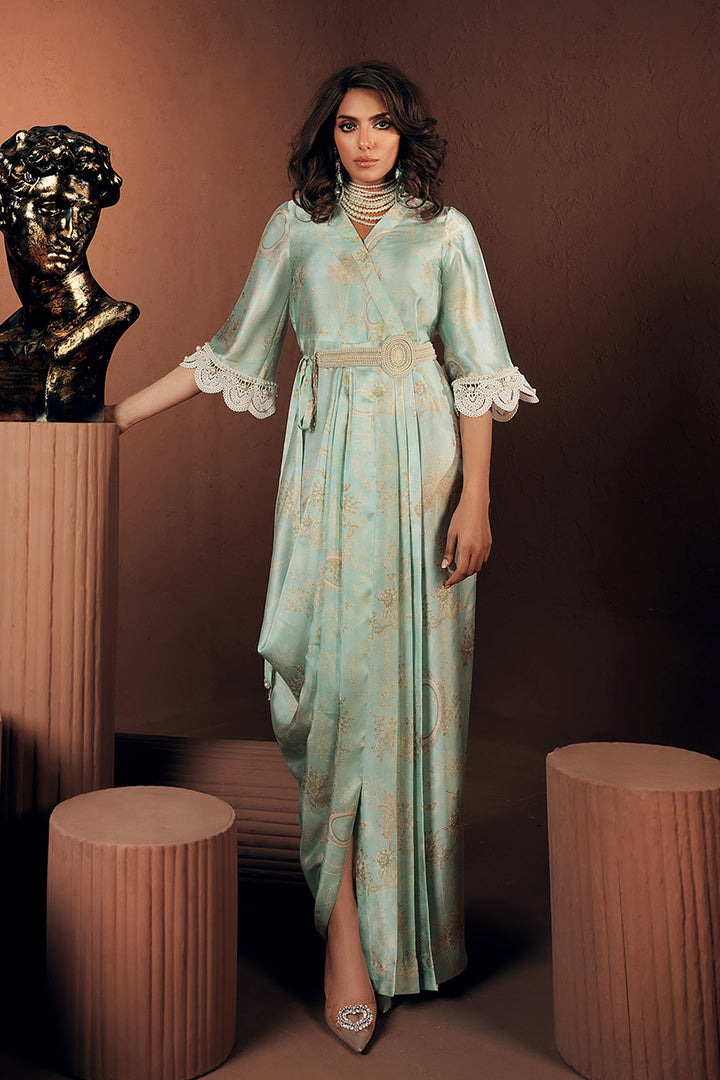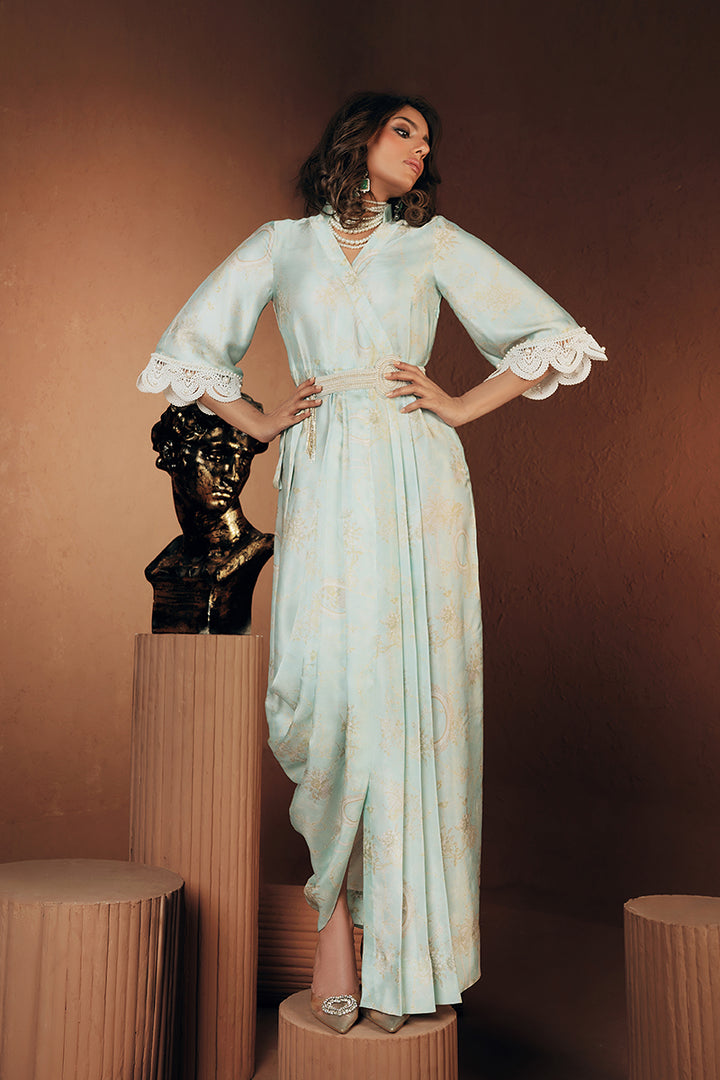 A canvas of art and elegance. This luxury digitally printed drape, featuring our Tiger in the Mirror print, is available in icy blue. Intricately embroidered with delicate lacework and shimmering pearl embellishments. Paired with a heavily embroidered belt to beautifully accentuate the silhouette, creating a look that’s stunning, sophisticated, and unforgettable.