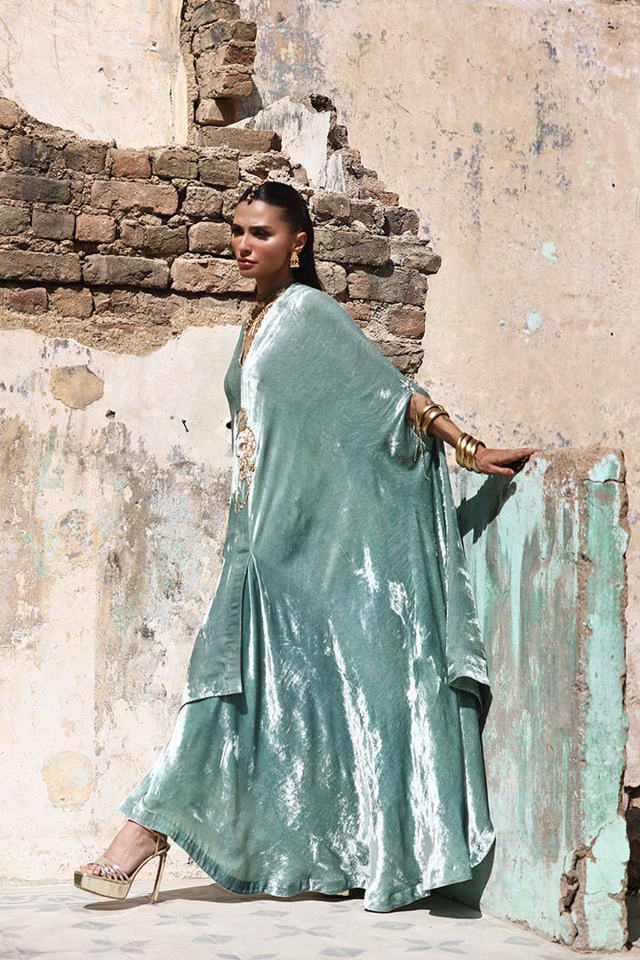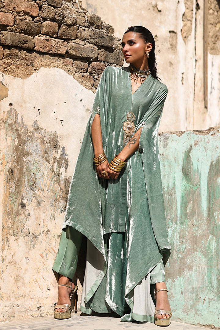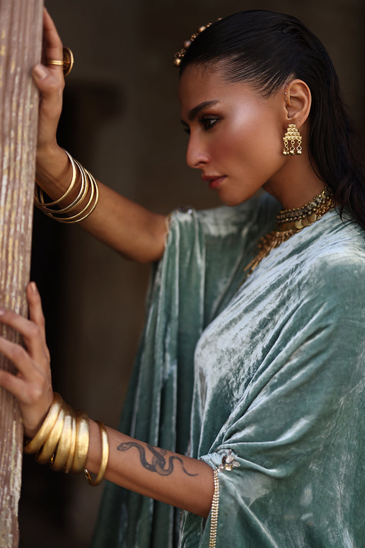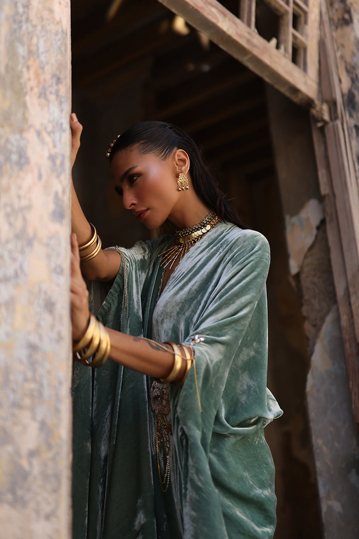 An ode to timeless craftsmanship, this signature formal drape is meticulously handcrafted in two-tone pure velvet, bathed in a lush smoky sage hue that evokes quiet opulence.