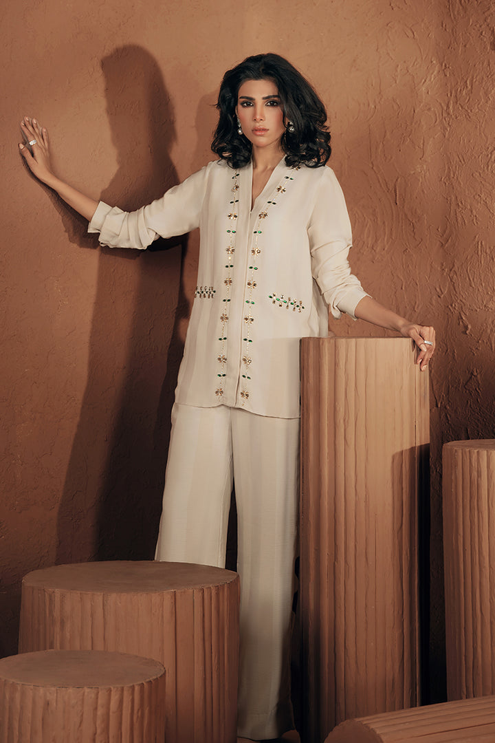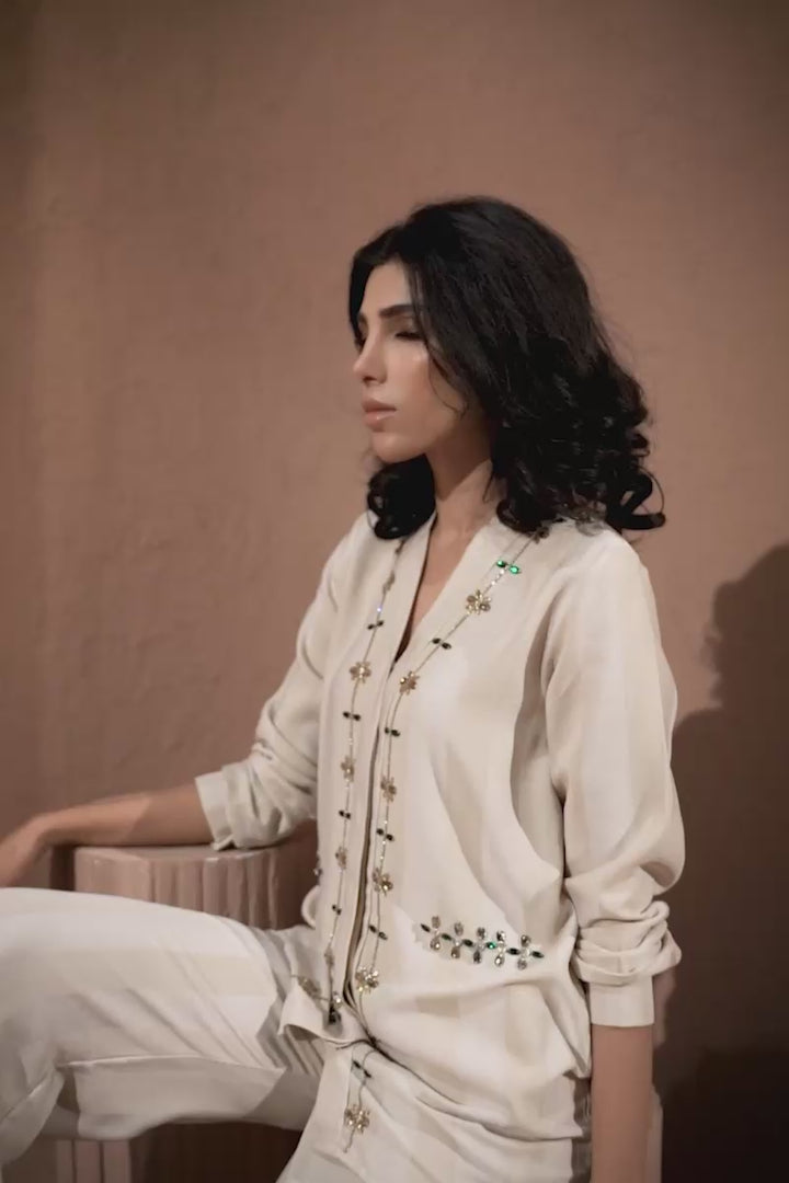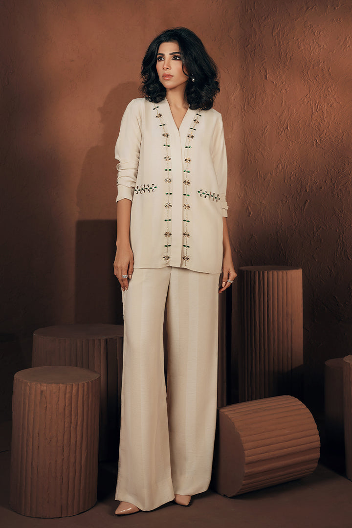 This chic printed coordinate beige is adorned with stone, crystal work, and chain detailing, bringing in a touch of sparkle to your everyday elegance. Paired with sleek pants for a look that’s polished, modern, and effortlessly stunning.