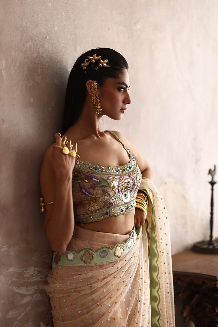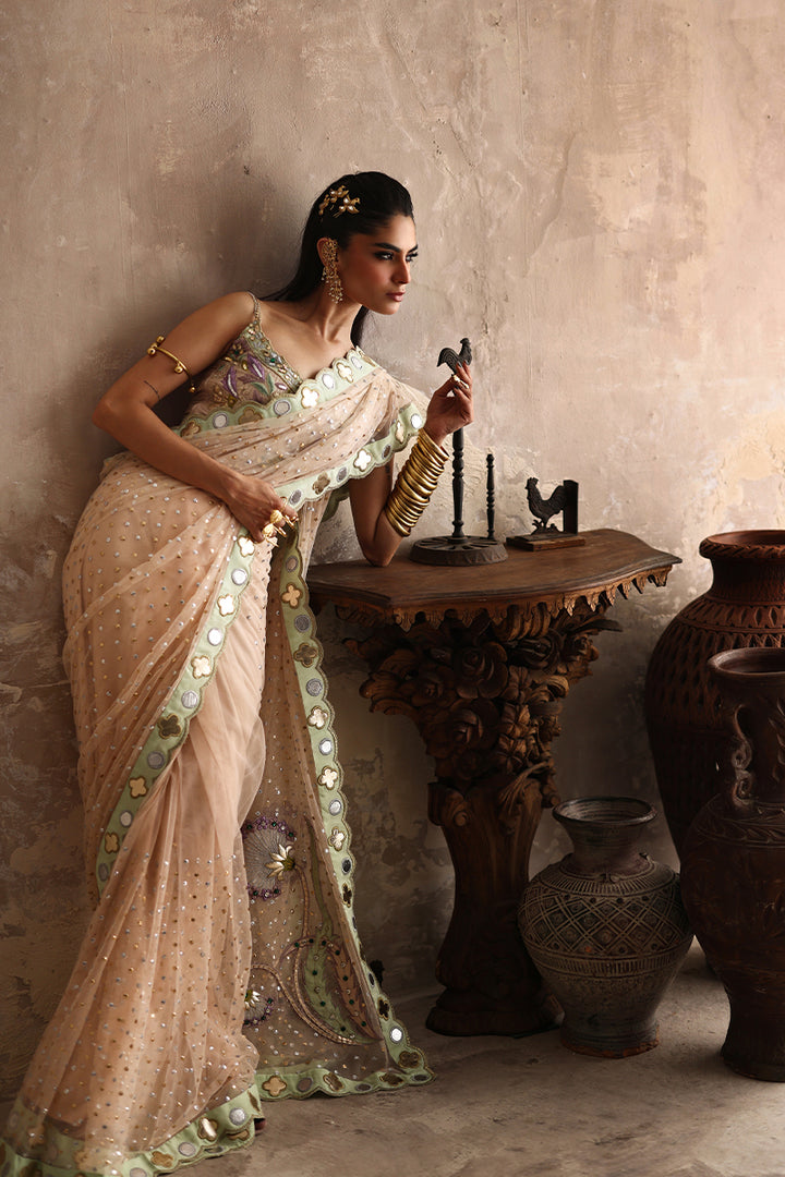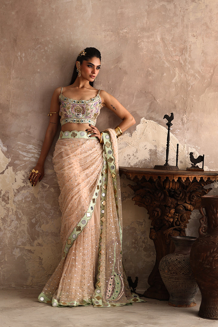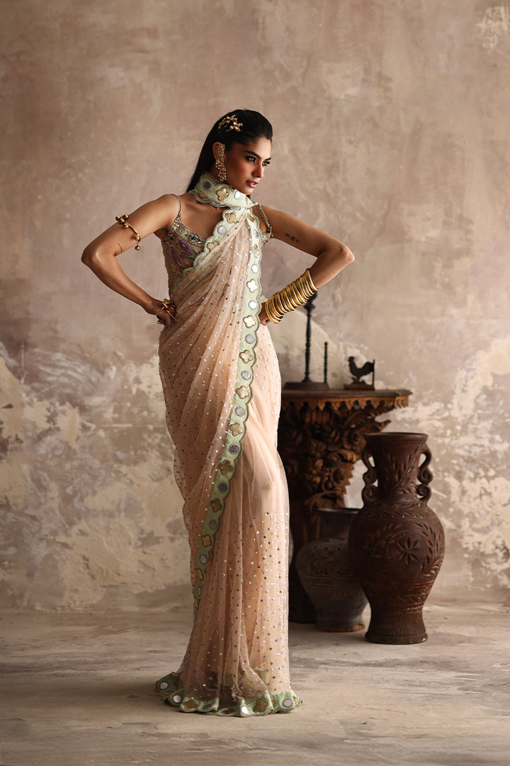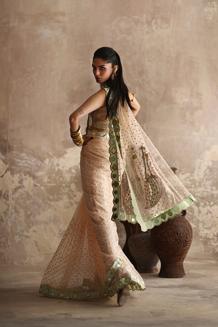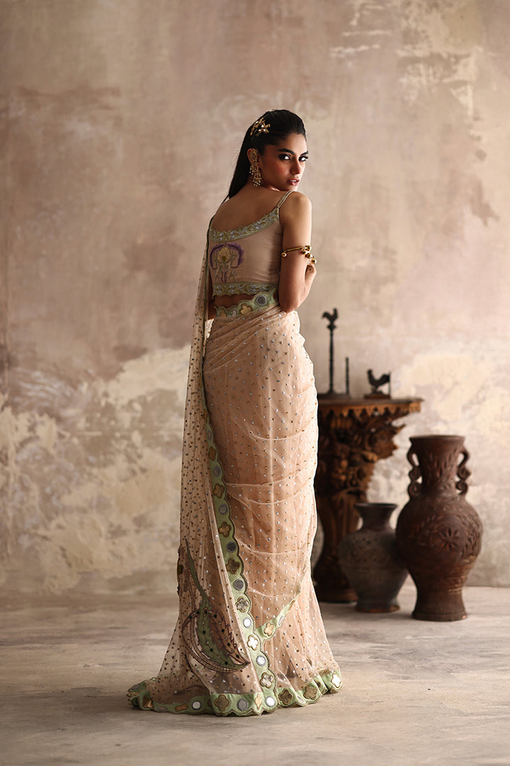 Radiating pure sophistication, this pre-stitched saree in a soft nude shade is crafted from net and draped to perfection. Intricately hand-embroidered with zardozi, resham threadwork, crystals, and sequins, it features our signature leather appliqué border and a handcrafted blouse adorned with Swarovski crystals and gota detailing. A true embodiment of craftsmanship, luxury, and timeless allure.