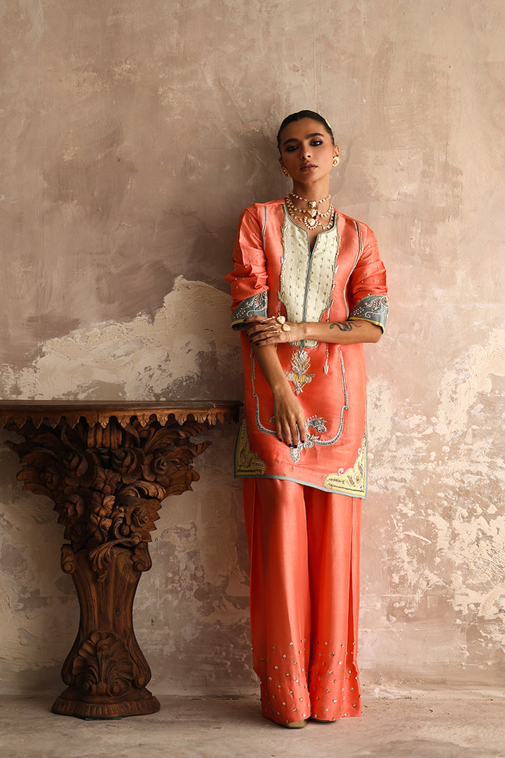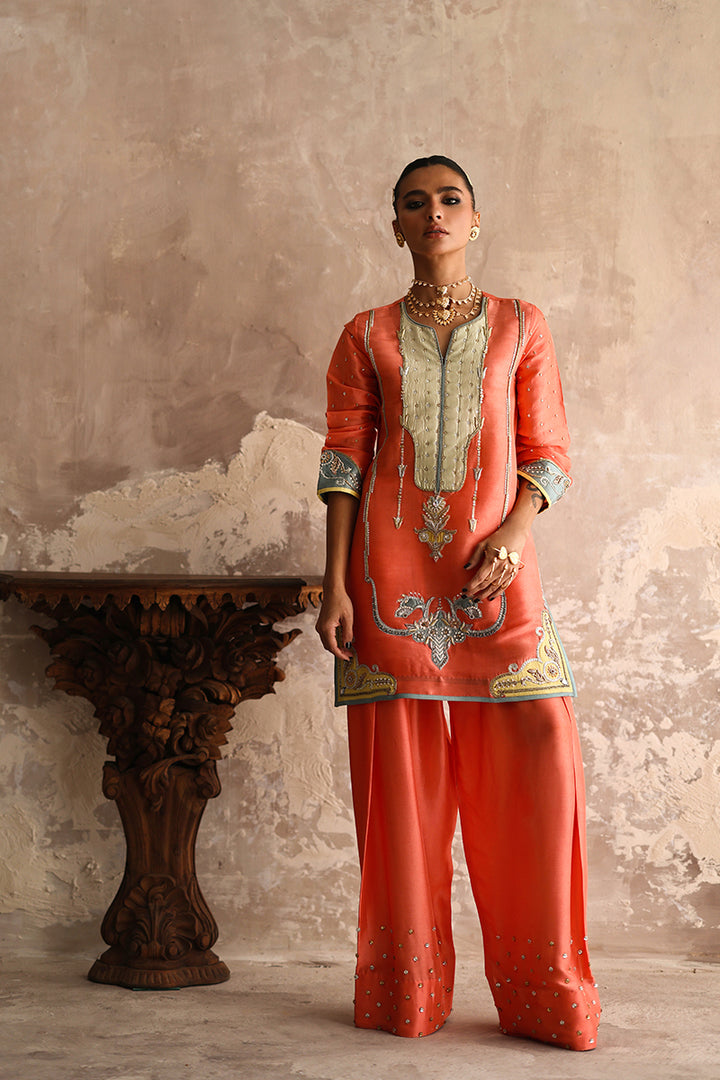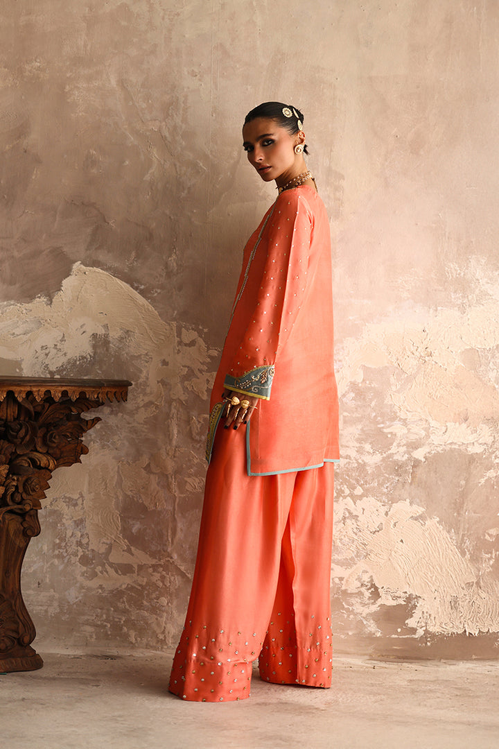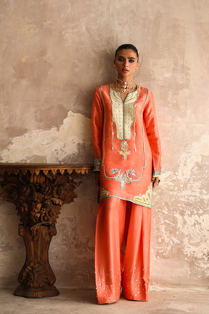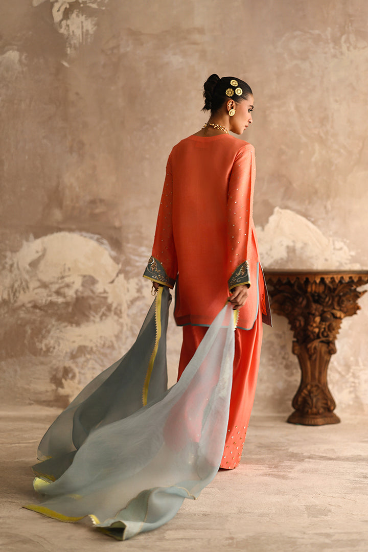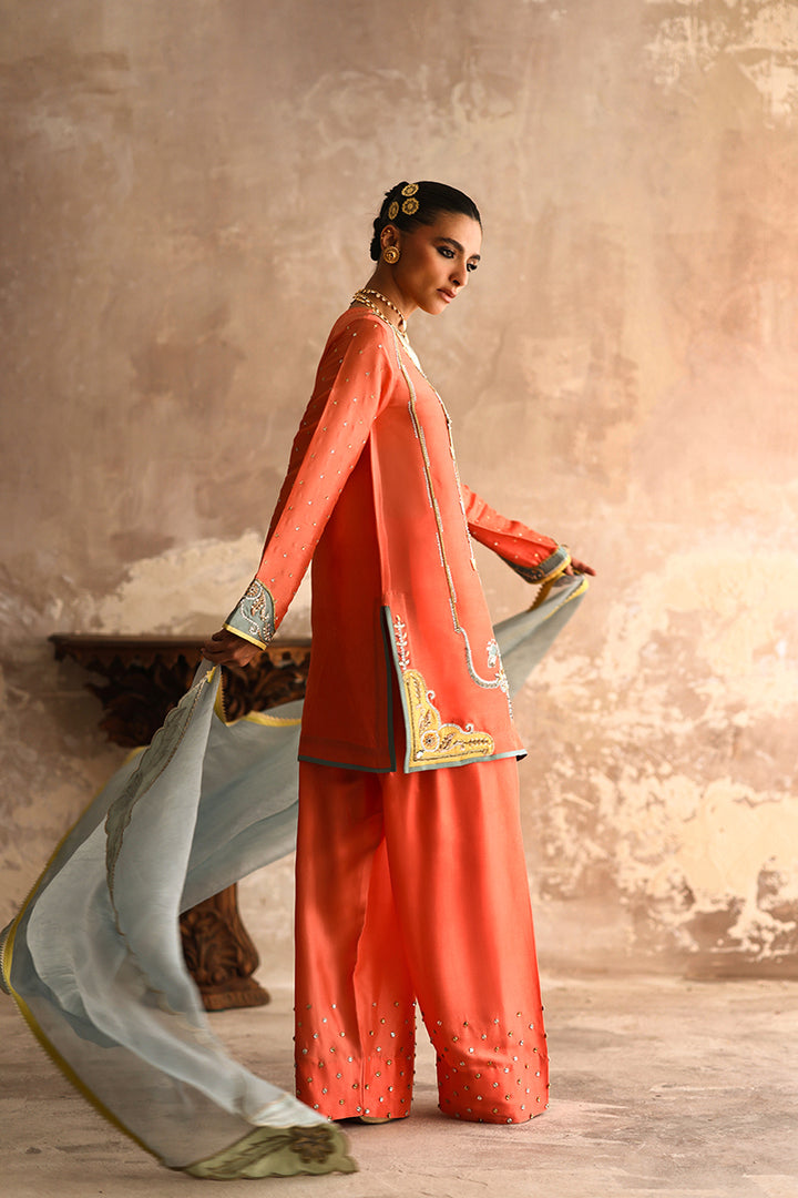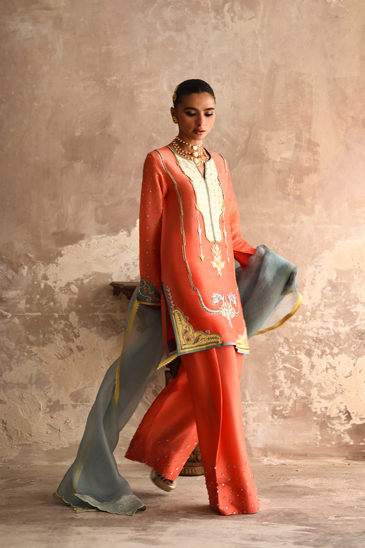 An ode to artistry and craftsmanship, this timeless Premium Sheesha Silk Shirt in a rich Coral hue is adorned with exquisite hand embroidery, featuring zardoze, Swarovski Crystals, and Intricate Appliqué details. Paired with a Swarovski crystal embellished shalwar and a pure organza dupatta featuring our signature leather appliqué motifs and Ganga Jamna zari work.