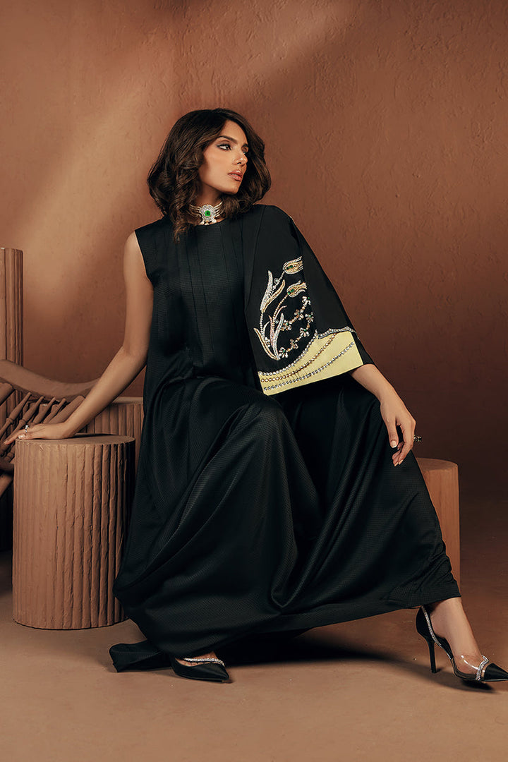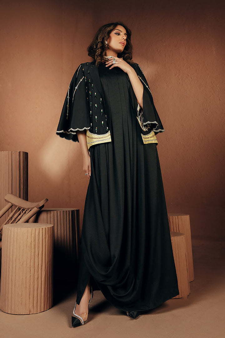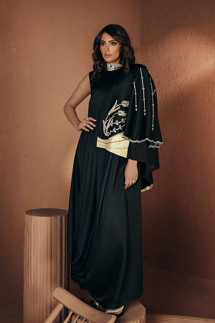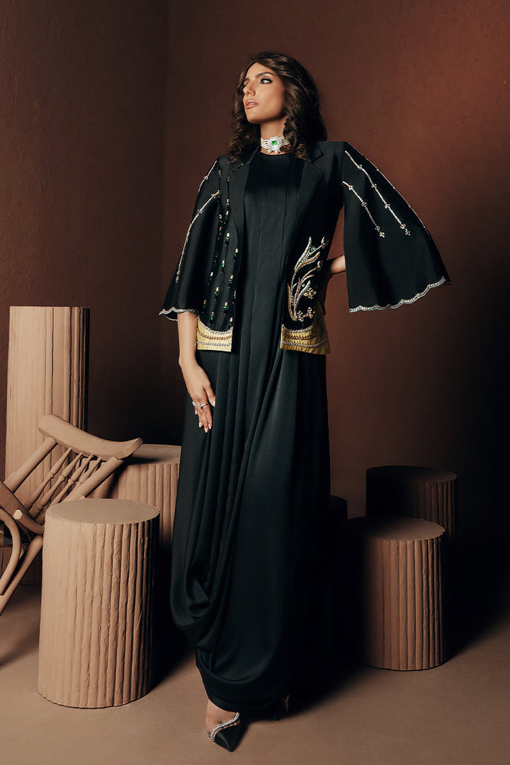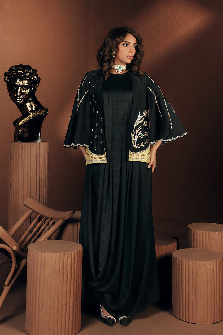 An avant-garde interplay of structure and fluidity, this Cape Jacket redefines evening glamour. Exquisitely hand-embroidered and encrusted with precious crystals, it glimmers with opulent detail, while a whisper of lime infuses a daring modern twist. Paired with our signature drape, it’s a red-carpet statement crafted for the bold and the beautiful.