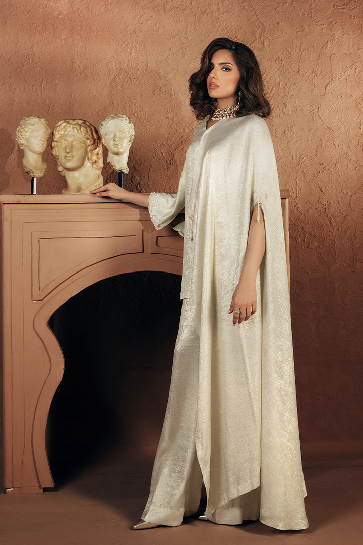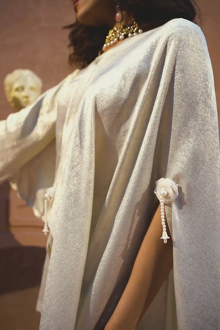 Formal A-Symmetrical drape top in shimmering ivory, adorned with delicate pearls, shells & tulip embellishments, and Handmade 3D Florals. Paired with matching boot-cut pants for a look that’s pure sophistication.