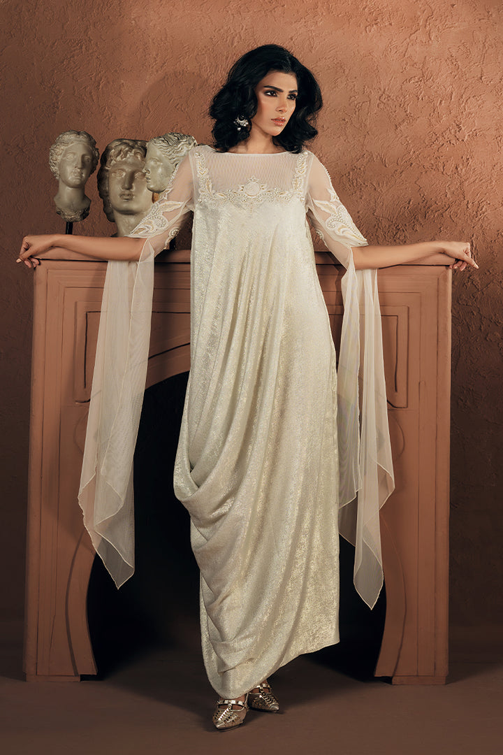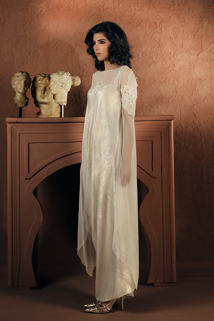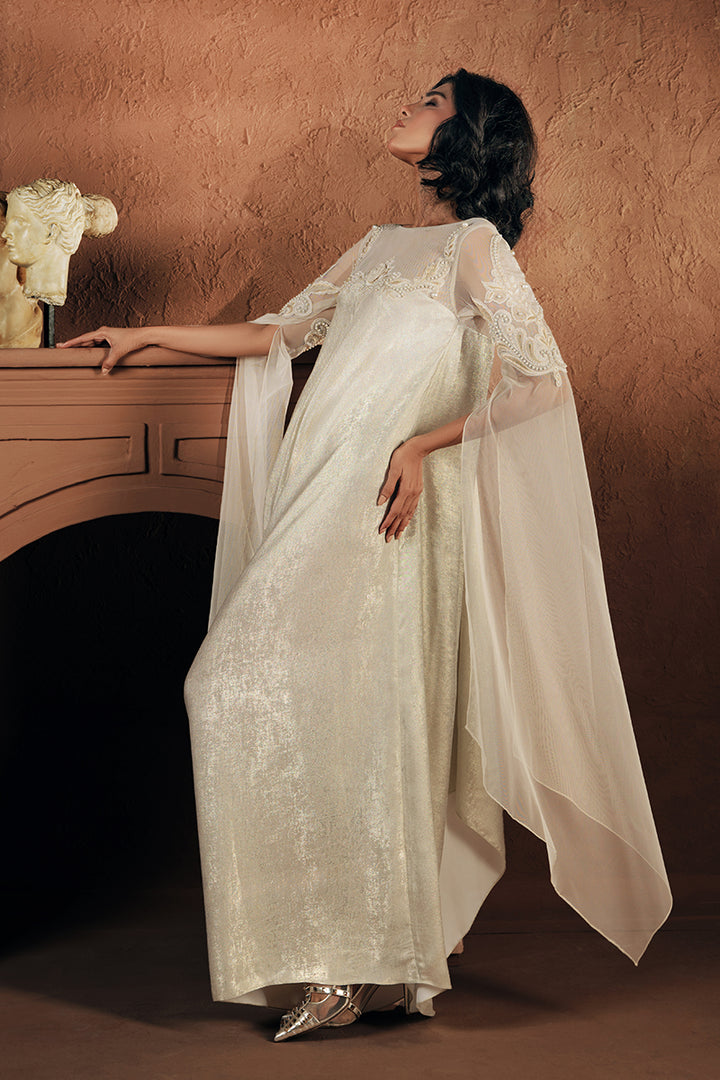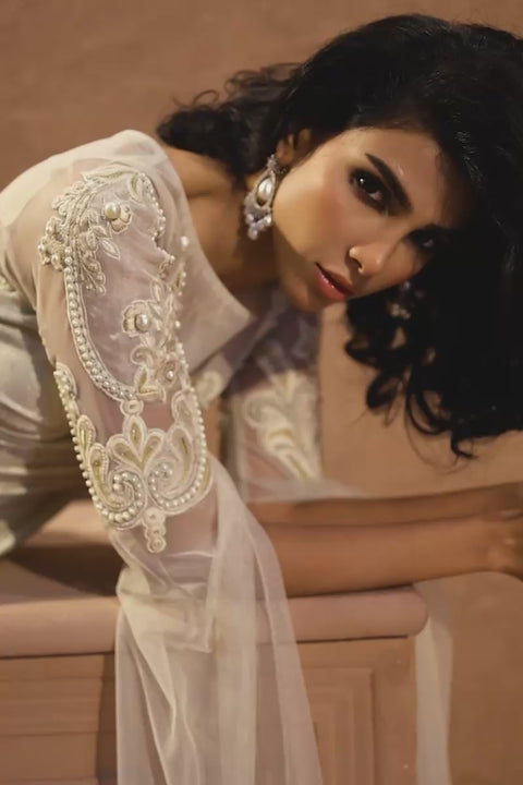 A vision in shimmering ivory, this formal luxury drape is lavishly adorned with intricate hand embroidery, resham threadwork, lustrous pearls, and handcrafted 3D Florals with delicate net detailing. Dramatic statement sleeves add the ultimate touch of glamour and grandeur.
