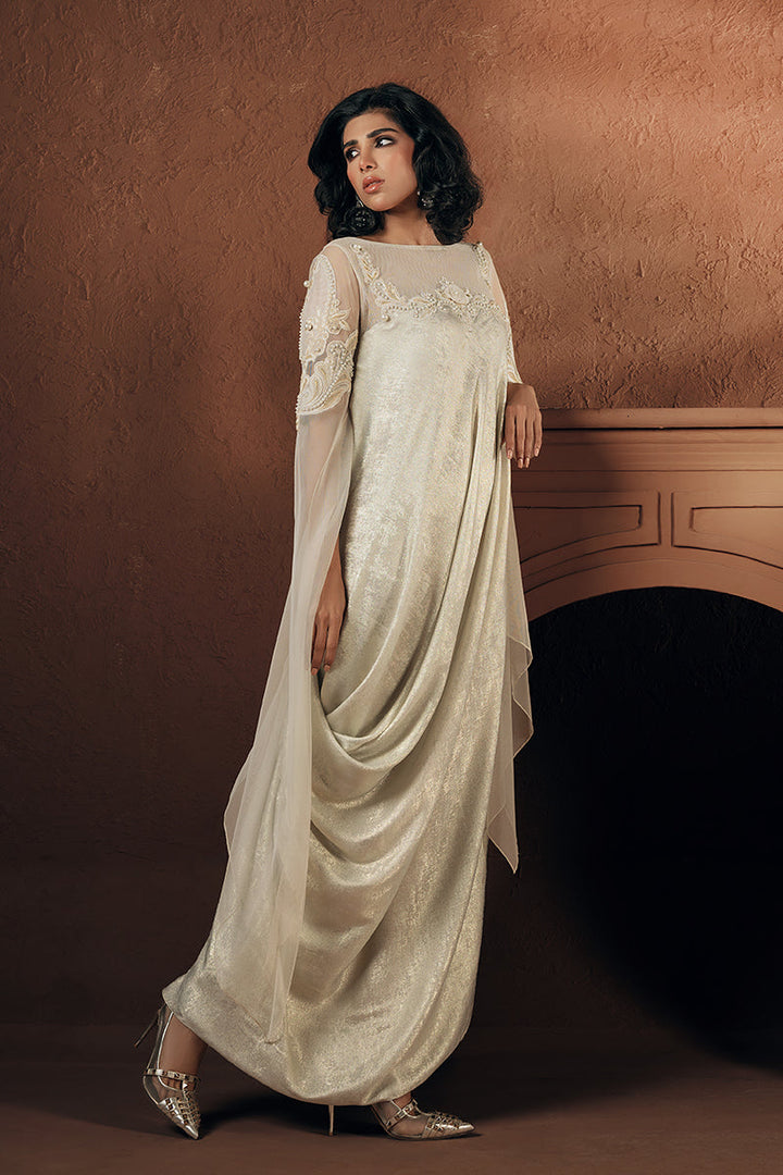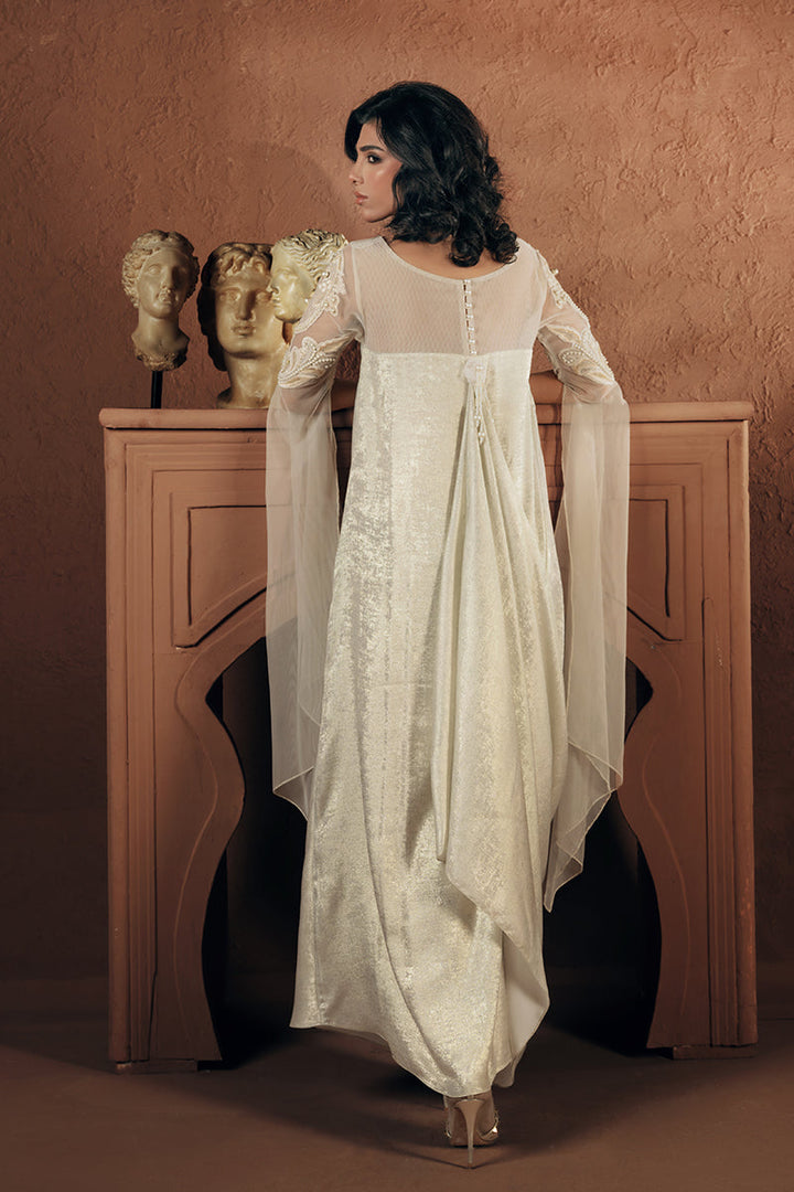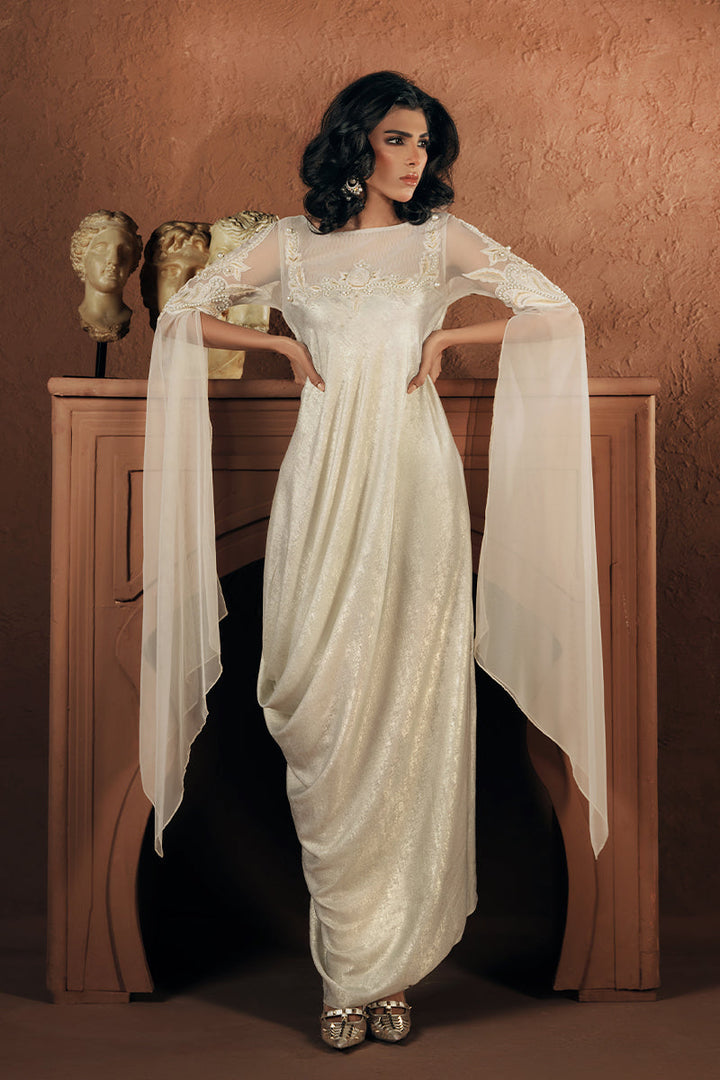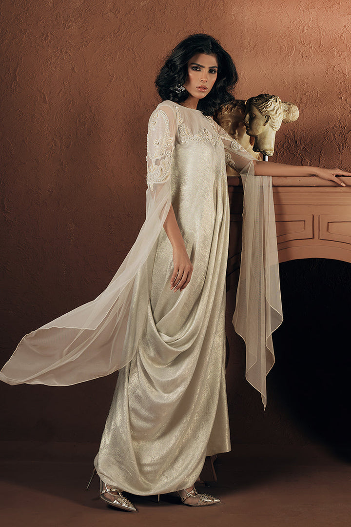 A vision in shimmering ivory, this formal luxury drape is lavishly adorned with intricate hand embroidery, resham threadwork, lustrous pearls, and handcrafted 3D Florals with delicate net detailing. Dramatic statement sleeves add the ultimate touch of glamour and grandeur.