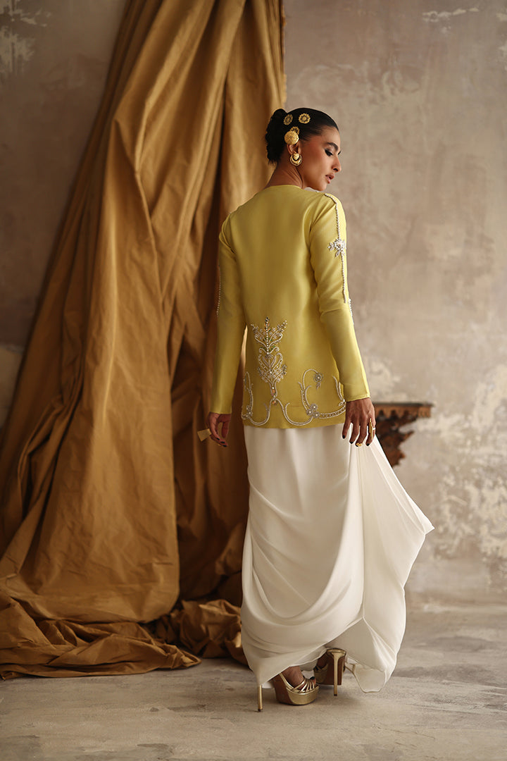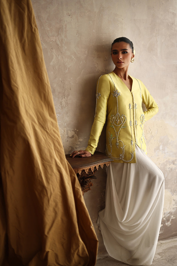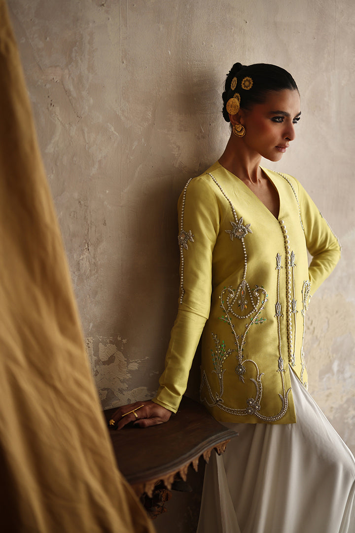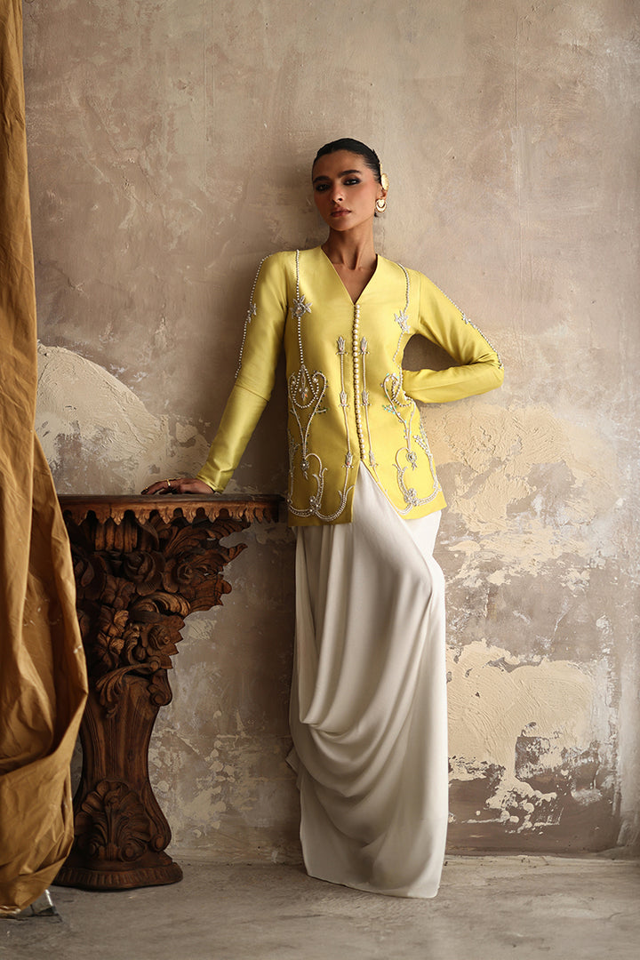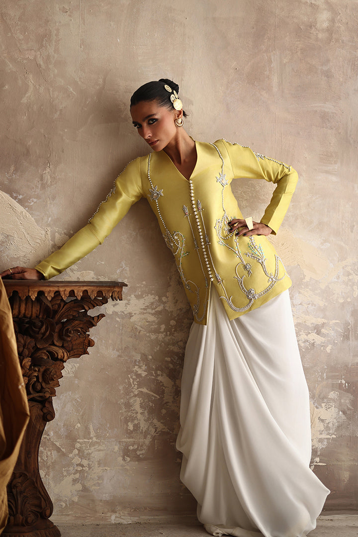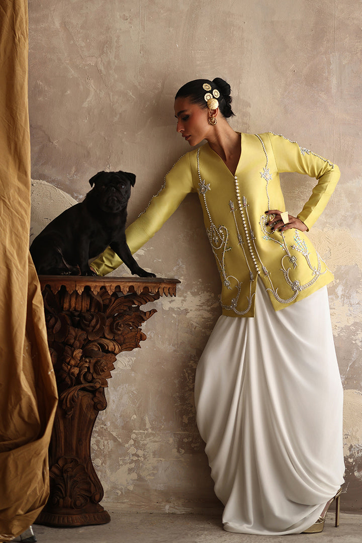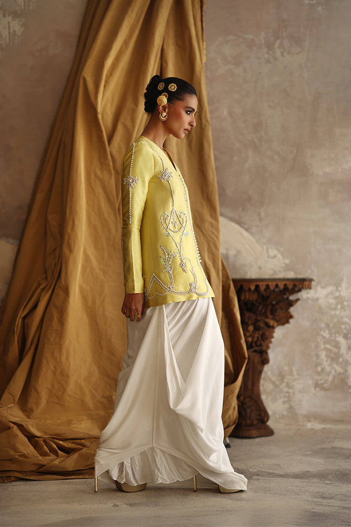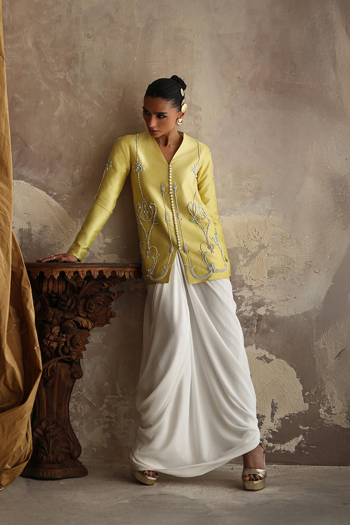 A vision of craftsmanship and contemporary elegance, this stunning lime green ensemble is designed to captivate. The formal jacket is exquisitely hand-embroidered with zardozi, crystal, and pearl work, paired with a graceful drape skirt that adds a touch of modern sophistication. A perfect blend of timeless artistry and luxe allure.