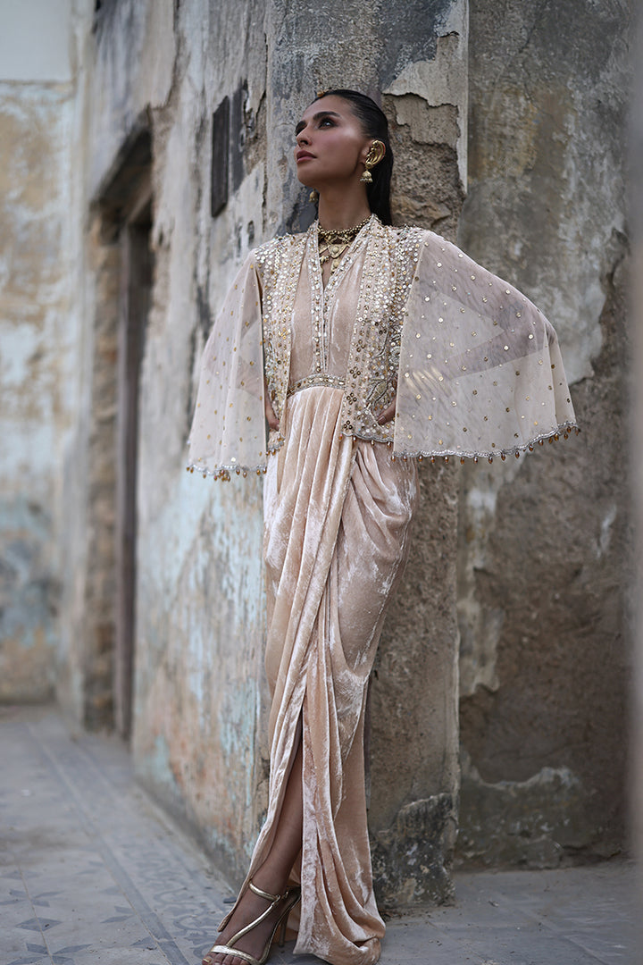 Make an unforgettable statement in this exquisite formal drape, handcrafted from two-toned pure velvet in a soft rose nude hue that exudes understated opulence. The velvet drape dress is paired with a formal net cape, meticulously hand-embroidered with intricate zardozi work, shimmering crystals, and delicate sequins, a true showcase of artisanal mastery.