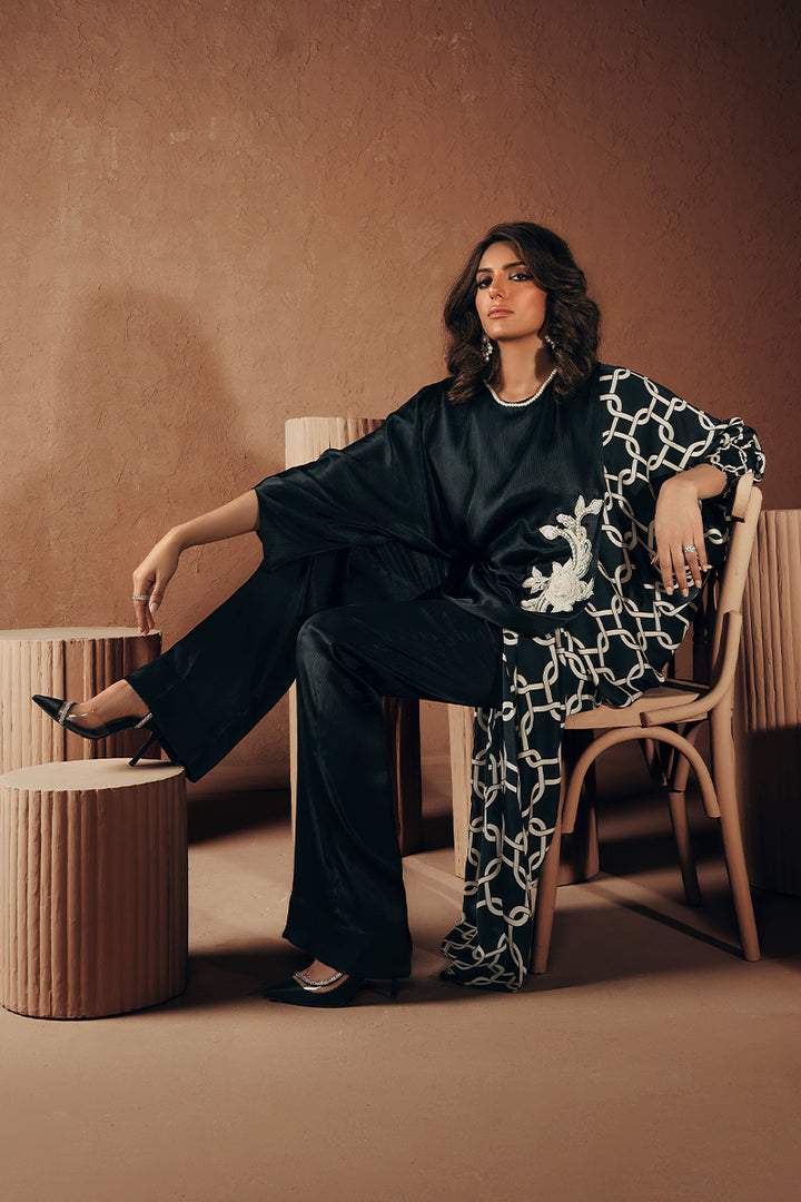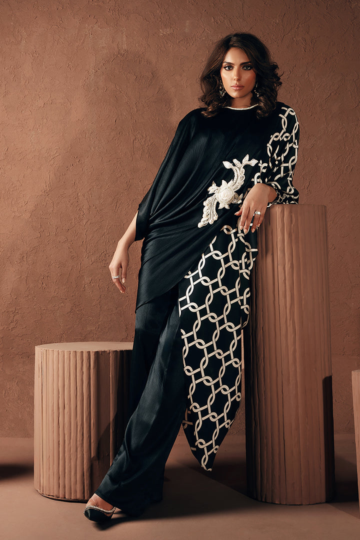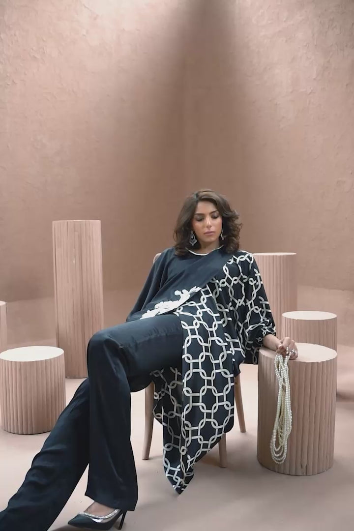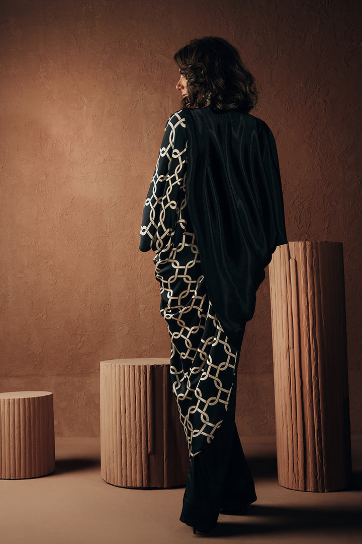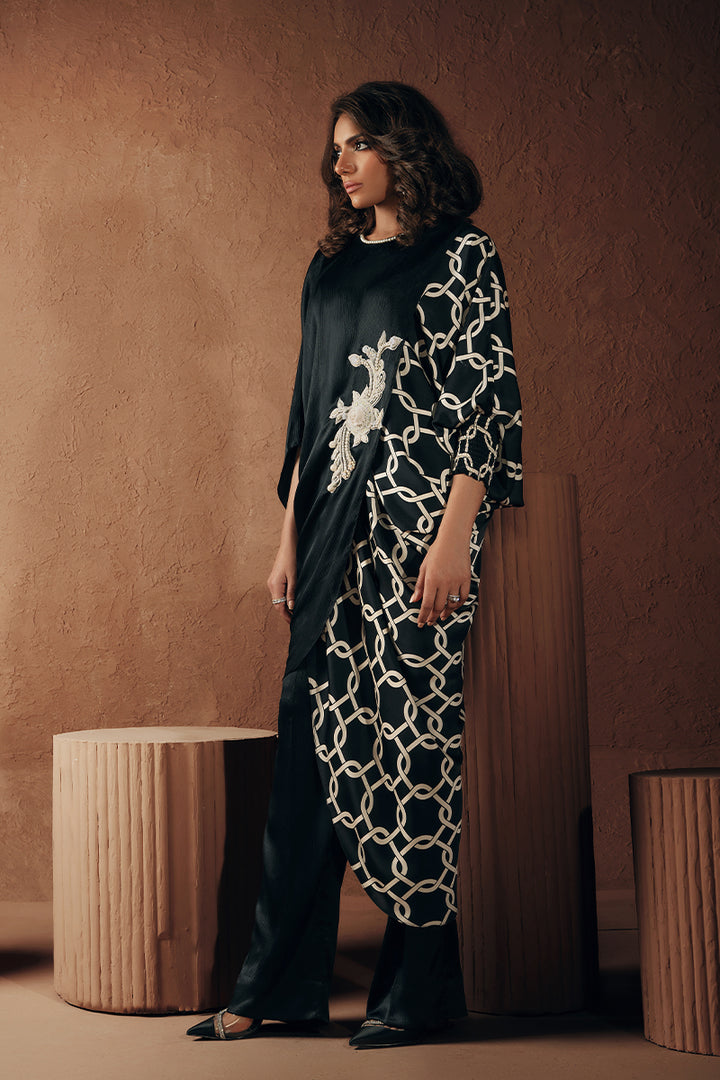 Bold. Modern. Unforgettable. This edgy drape celebrates master craftsmanship, blending solid black with a striking geometric print in a daring silhouette. Adorned with an intricately embroidered motif and delicate pearl embellishments, paired with sleek, straight pants for an effortlessly chic and contemporary look.