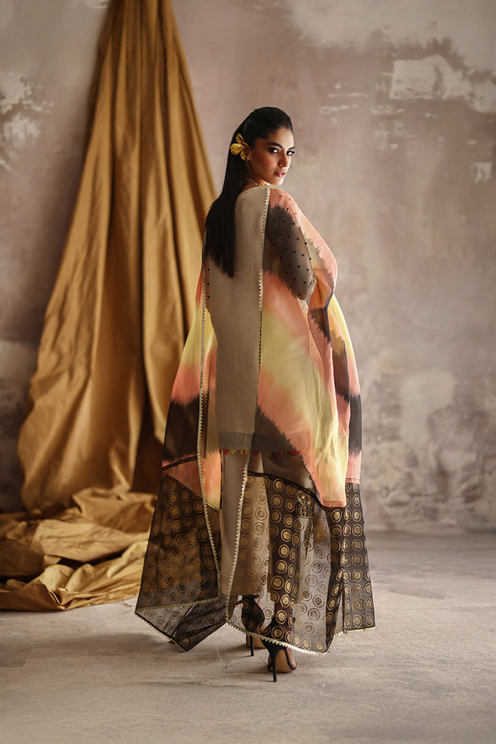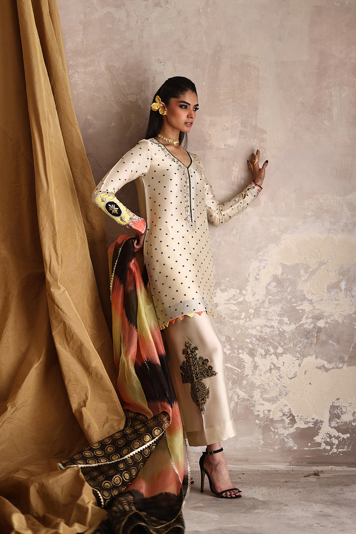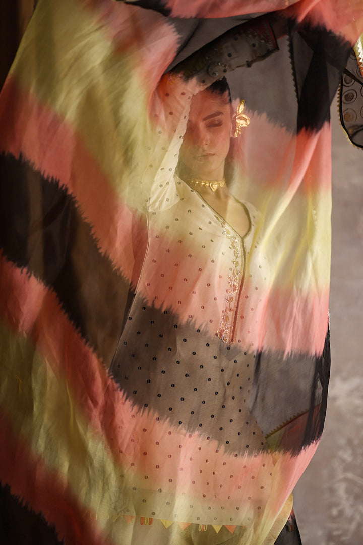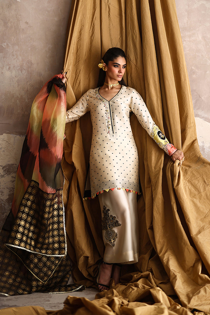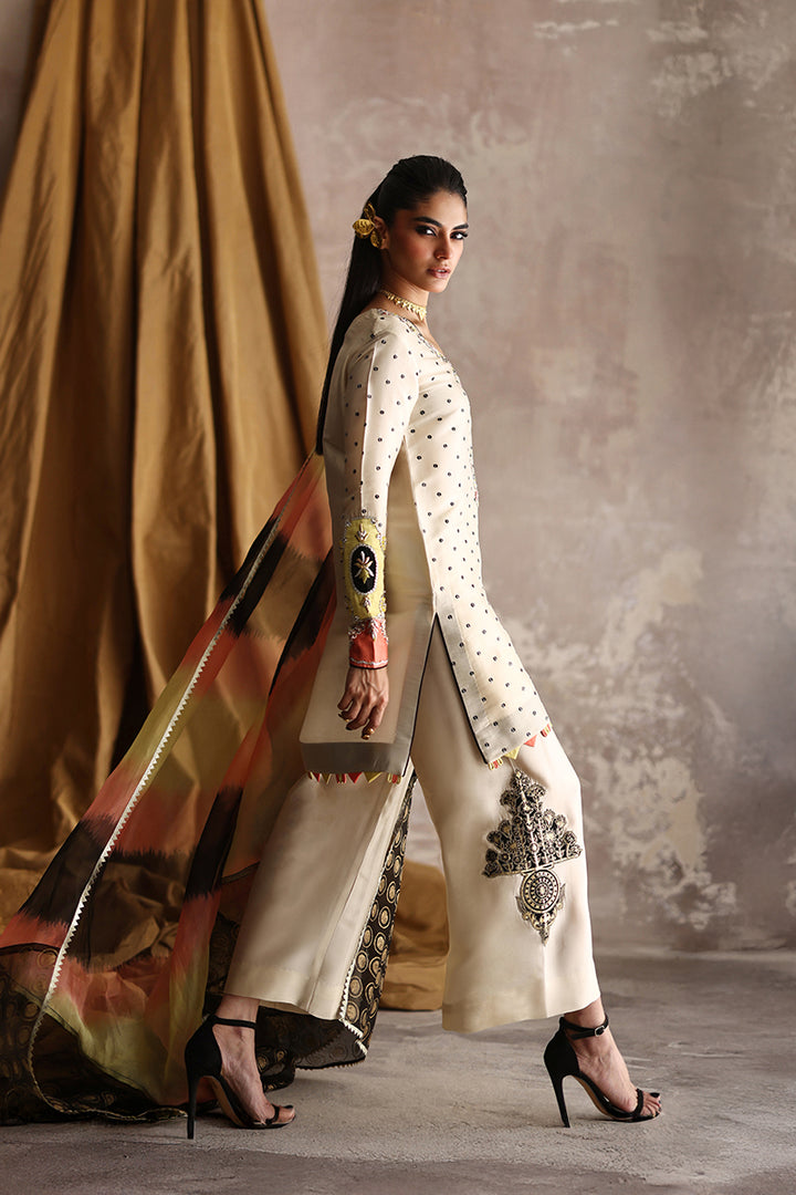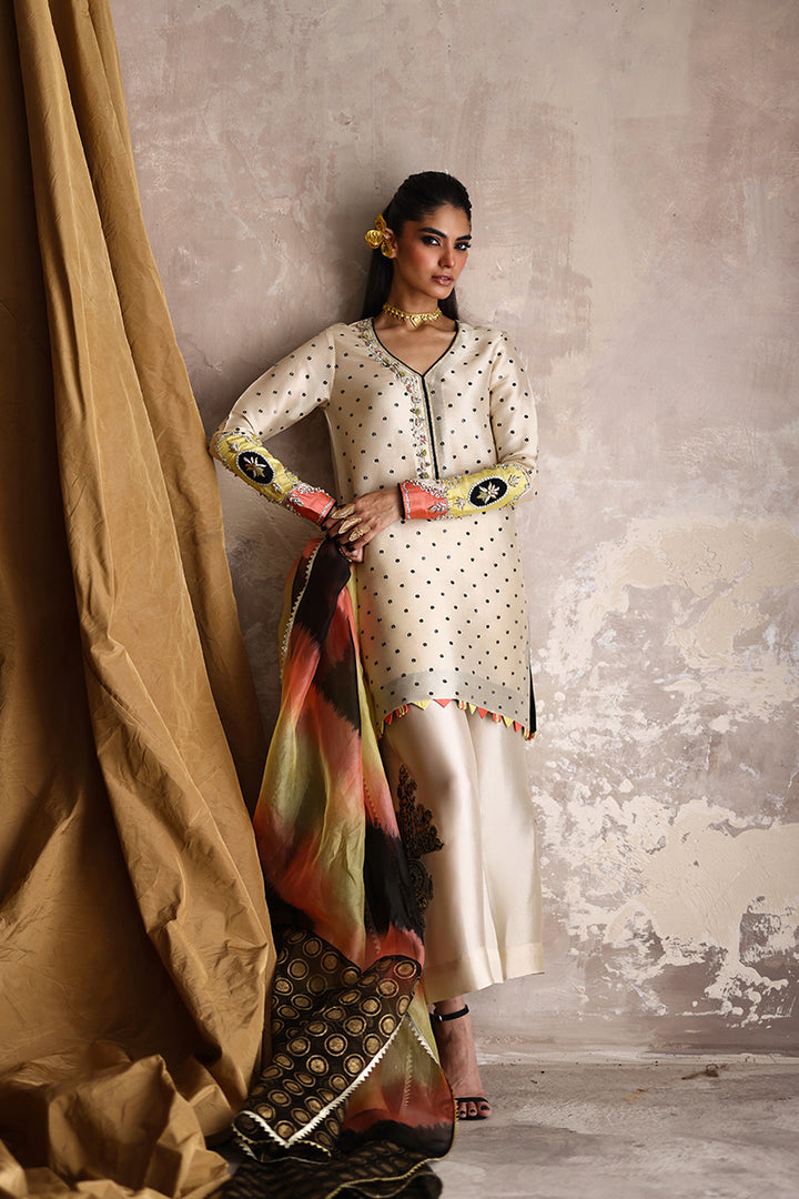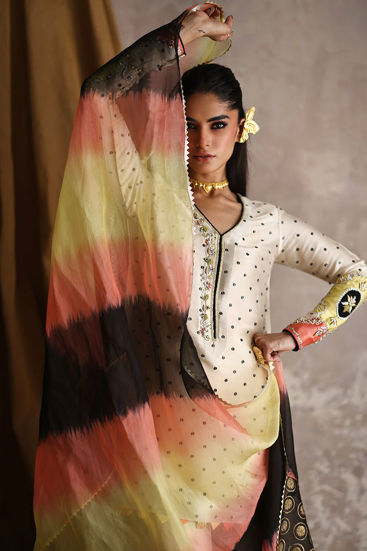 A timeless ensemble that blends heritage with refined modernity. Formal Premium Sheesha Silk Shirt in a beautiful Ivory shade, exquisitely hand-embroidered with zardozi and sequin work, finished with delicate kingri and loop accents. Paired with a foil-printed Izaar featuring appliqué motifs, and a pure organza lehria hand block printed Dupatta.