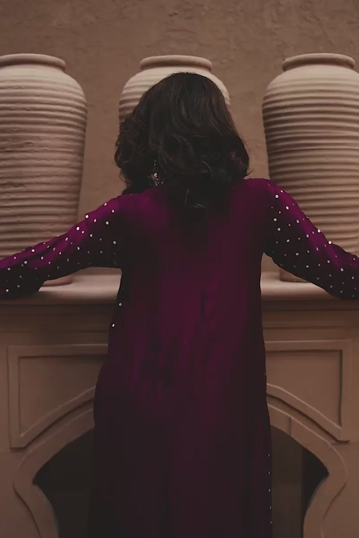 A formal kaftan in a gorgeous deep plum hue, featuring intricate hand embroidery of zardozi & sequin. Beautifully highlighted with Emerald Stones. A true celebration of timeless elegance and luxury.