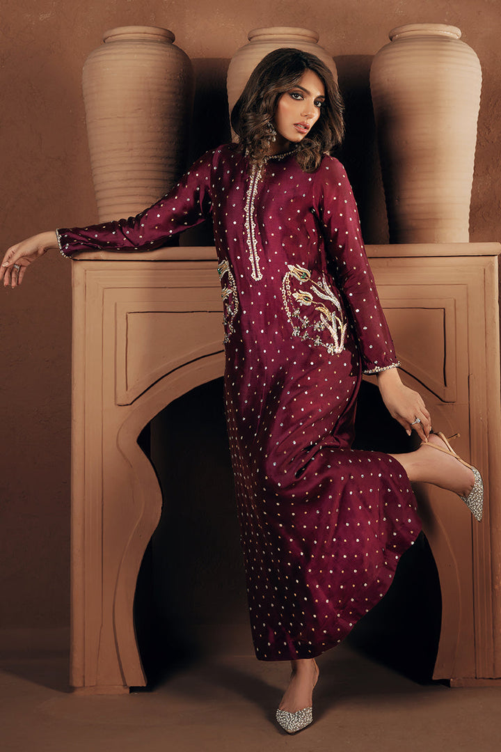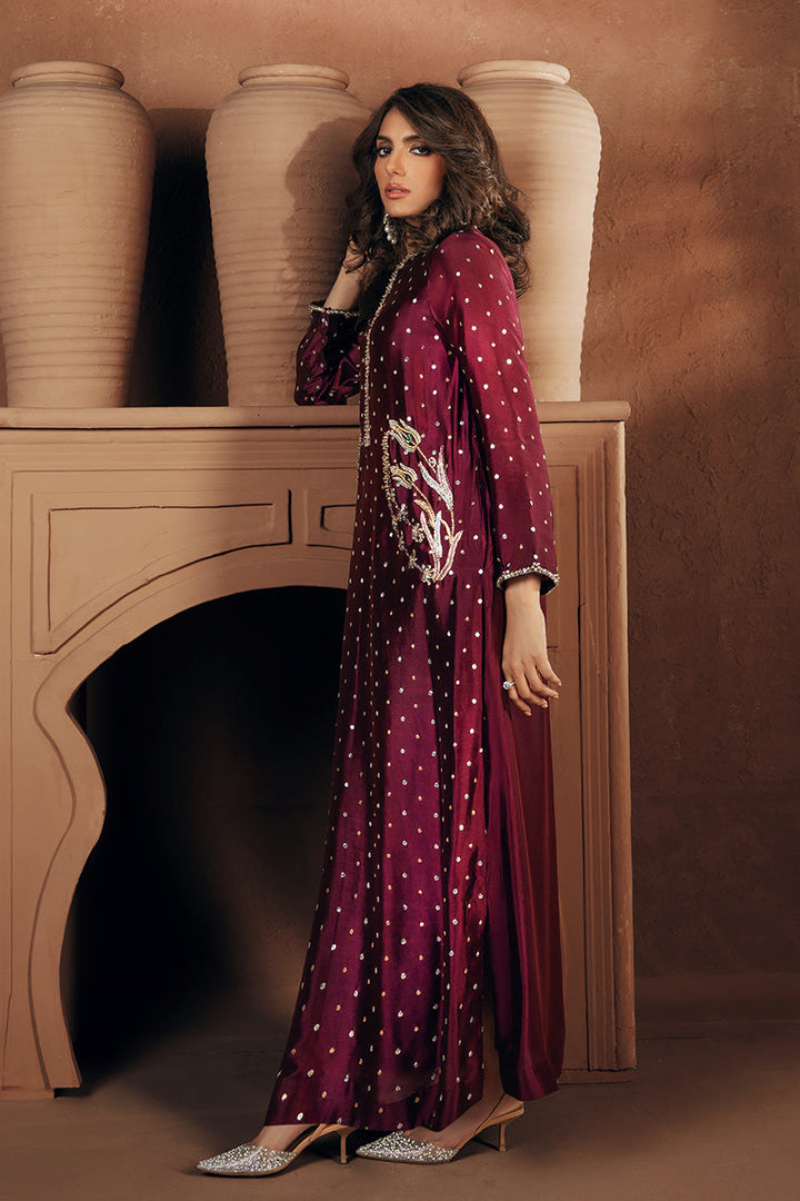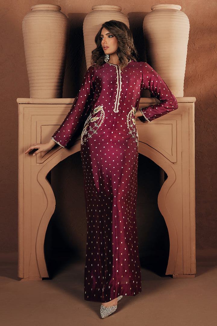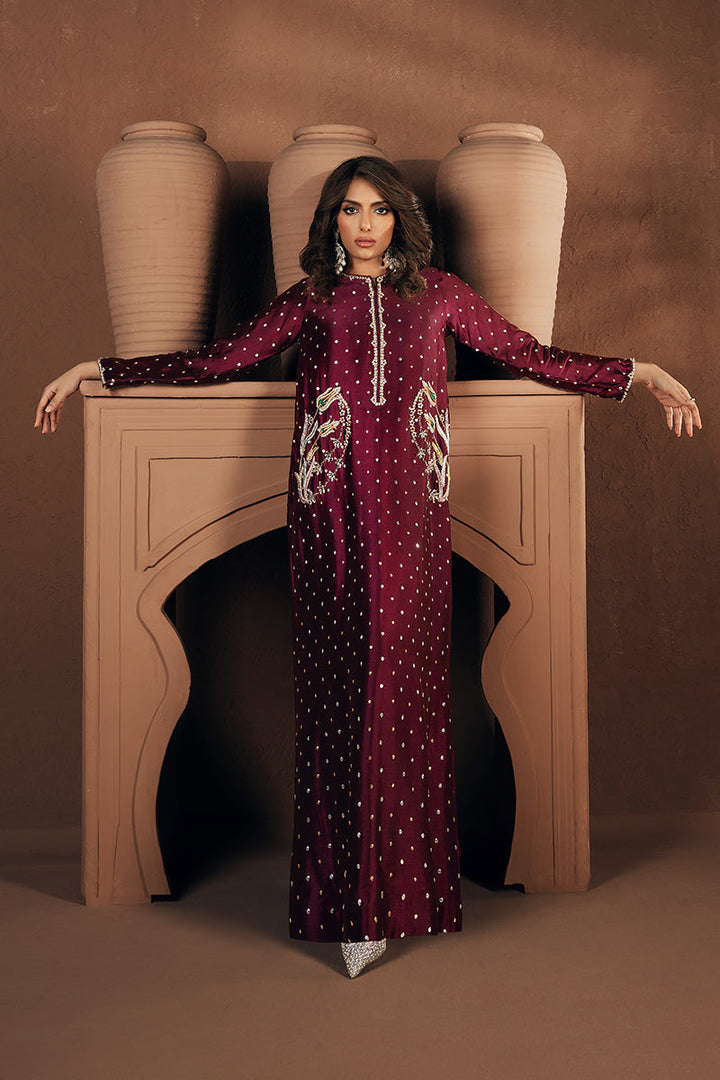 A formal kaftan in a gorgeous deep plum hue, featuring intricate hand embroidery of zardozi & sequin. Beautifully highlighted with Emerald Stones. A true celebration of timeless elegance and luxury.